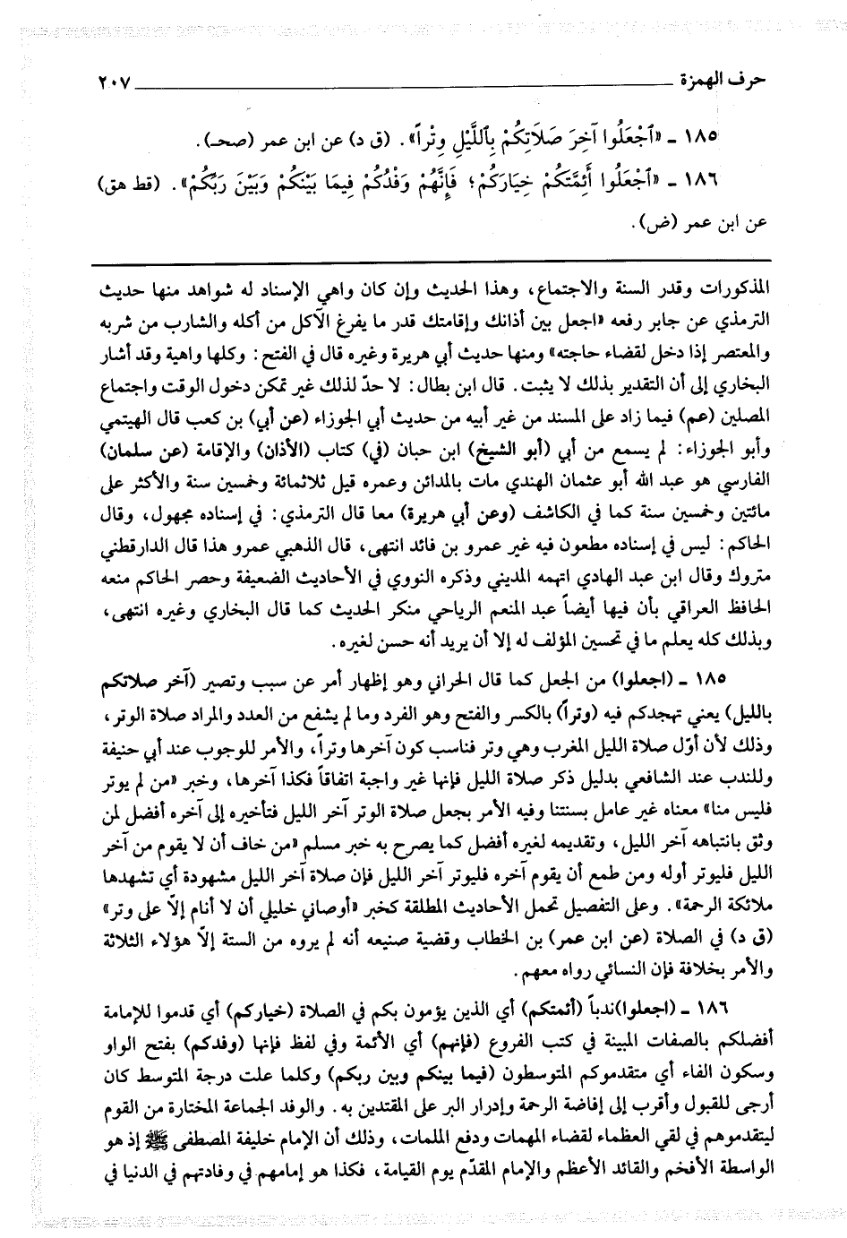 185 - (اجعلوا) من الجعل كما قال الحراني وهو إظهار أمر عن سبب وتصيير (آخر صلاتكم بالليل) يعني تهجدكم فيه (وترا) بالكسر والفتح وهو الفرد ما لم يشفع من العدد والمراد صلاة الوتر وذلك لأن أول صلاة الليل المغرب وهي وتر فناسب كون آخرها وترا والأمر للوجوب عند أبي حنيفة وللندب عند الشافعي بدليل ذكر صلاة الليل فإنها غير واجبة اتفاقا فكذا آخرها وخبر من لم يوتر فليس منا معناه غير عامل بسنتنا وفيه الأمر بجعل صلاة الوتر آخر الليل فتأخيره إلى آخره أفضل لمن وثق بانتباهه آخر الليل وتقديمه لغيره أفضل كما يصرح به خبر مسلم " من خاف أن لا يقوم من آخر الليل فليوتر أوله ومن طمع أن يقوم آخره فليوتر آخر الليل فإن صلاة آخر الليل مشهودة أي تشهدها ملائكة الرحمة وعلى التفصيل تحمل الأحاديث المطلقة كخبر أوصاني خليلي أن لا أنام إلا على وتر (ق د) في الصلاة (عن ابن عمر) بن الخطاب وقضية صنيعه أنه لم يروه من الستة إلا هؤلاء الثلاثة والأمر بخلافه فإن النسائي رواه معهم.