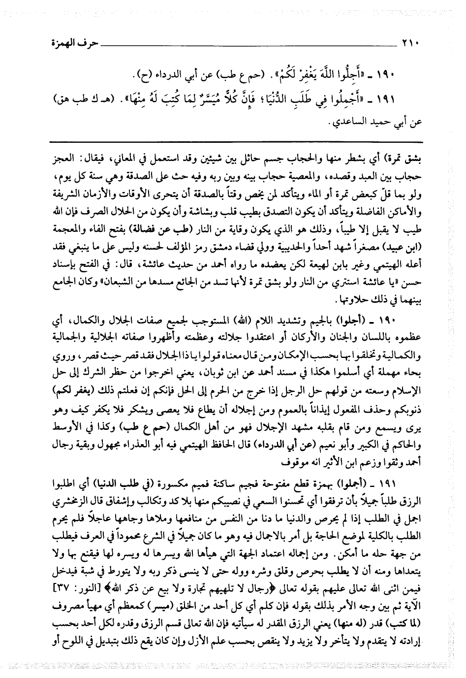 191 - (أجملوا) بهمزة قطع مفتوحة فجيم ساكنة فميم مكسورة (في طلب الدنيا) أي اطلبوا الرزق طلبا جميلا بأن ترفقوا أي تحسنوا السعي في نصيبكم منها بلا كد وتعب ولا تكالب وإشفاق.