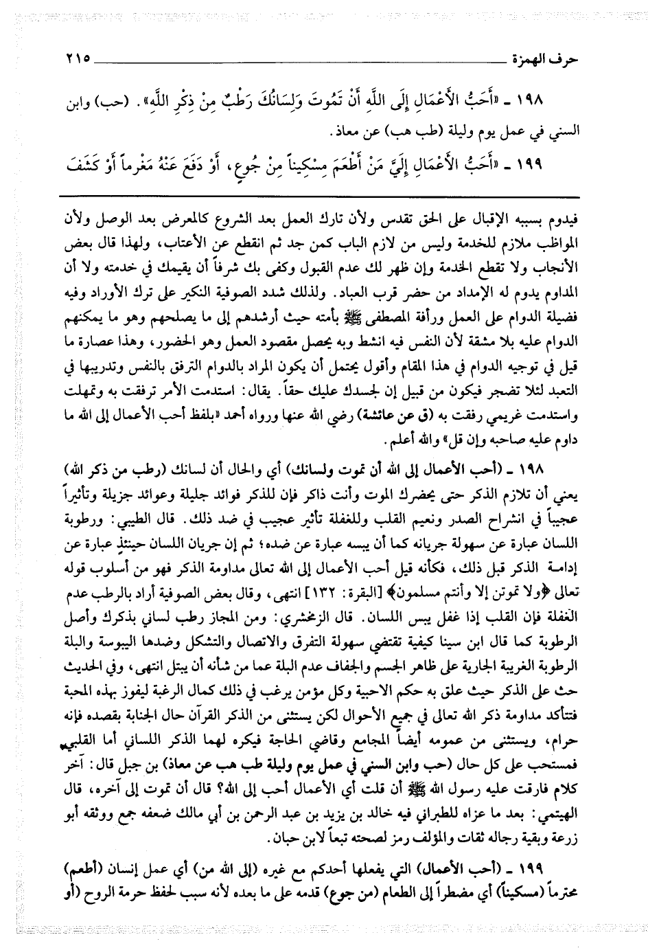 198 - (أحب الأعمال إلى الله أن تموت ولسانك) أي والحال أن لسانك (رطب من ذكر الله) يعني أن تلازم الذكر حتى يحضرك الموت وأنت ذاكر فإن للذكر فوائد جليلة وعوائد جزيلة وتأثيرا عجيبا في انشراح الصدر ونعيم القلب وللغفلة تأثير عجيب في ضد ذلك.