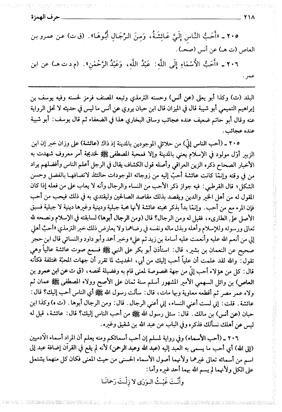 206 - (أحب الأسماء) وفي رواية لمسلم إن أحب أسمائكم ومنه يعلم أن المراد أسماء الآدميين (إلى الله) أي أحب ما يسمى به العبد إليه (عبد الله وعبد الرحمن) لأنه لم يقع في القرآن عبد إلى اسم من أسمائه تعالى غيرهما ولأنهما أصول الأسماء الحسنى من حيث المعنى فكان كل منهما يشتمل على الكل ولأنهما لم يسم الله بهما أحد غيره وأما : وأنت غيث الورى لا زلت رحمنا