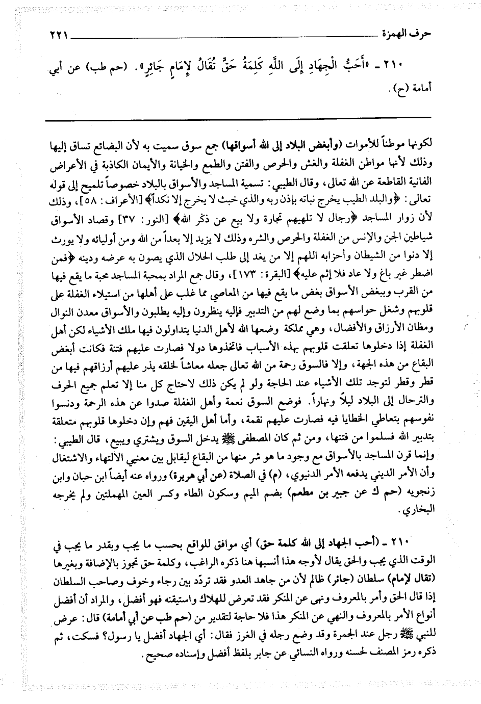210 - (أحب الجهاد إلى الله كلمة حق) أي موافق للواقع بحسب ما يجب وبقدر ما يجب في الوقت الذي يجب والحق يقال لأوجه هذا أنسبها هنا ذكره الراغب وكلمة حق تجوز بالإضافة وبغيرها (تقال لإمام) سلطان (جائر) ظالم لأن من جاهد العدو فقد تردد بين رجاء وخوف وصاحب السلطان إذا قال الحق وأمر بالمعروف ونهى عن المنكر فقد تعرض للهلاك واستيقنه فهو أفضل والمراد أن أفضل أنواع الأمر بالمعروف والنهي عن المنكر هذا فلا حاجة لتقدير من (حم طب عن أبي أمامة) قال : عرض للنبي صلى الله عليه وسلم رجل عند الجمرة وقد وضع رجله في الغرز فقال : أي الجهاد أفضل يا رسول الله فسكت ثم ذكره رمز المصنف لحسنه ورواه النسائي عن جابر بلفظ أفضل وإسناده صحيح.