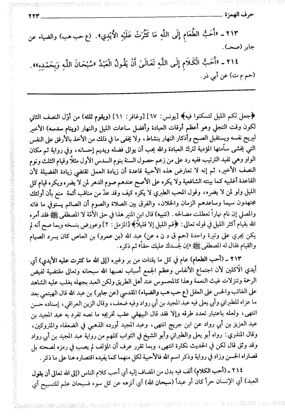 213 - (أحب الطعام) عام في كل ما يقتات من بر وغيره (إلى الله ما كثرت عليه الأيدي) أي أيدي الآكلين لأن اجتماع الأنفاس وعظم الجمع أسباب نصبها الله سبحانه وتعالى مقتضية لفيض الرحمة وتنزلات غيث النعمة وهذا كالمحسوس عند أهل الطريق ولكن العبد يجهله يغلب عليه الشاهد على الغائب والحس على العقل.