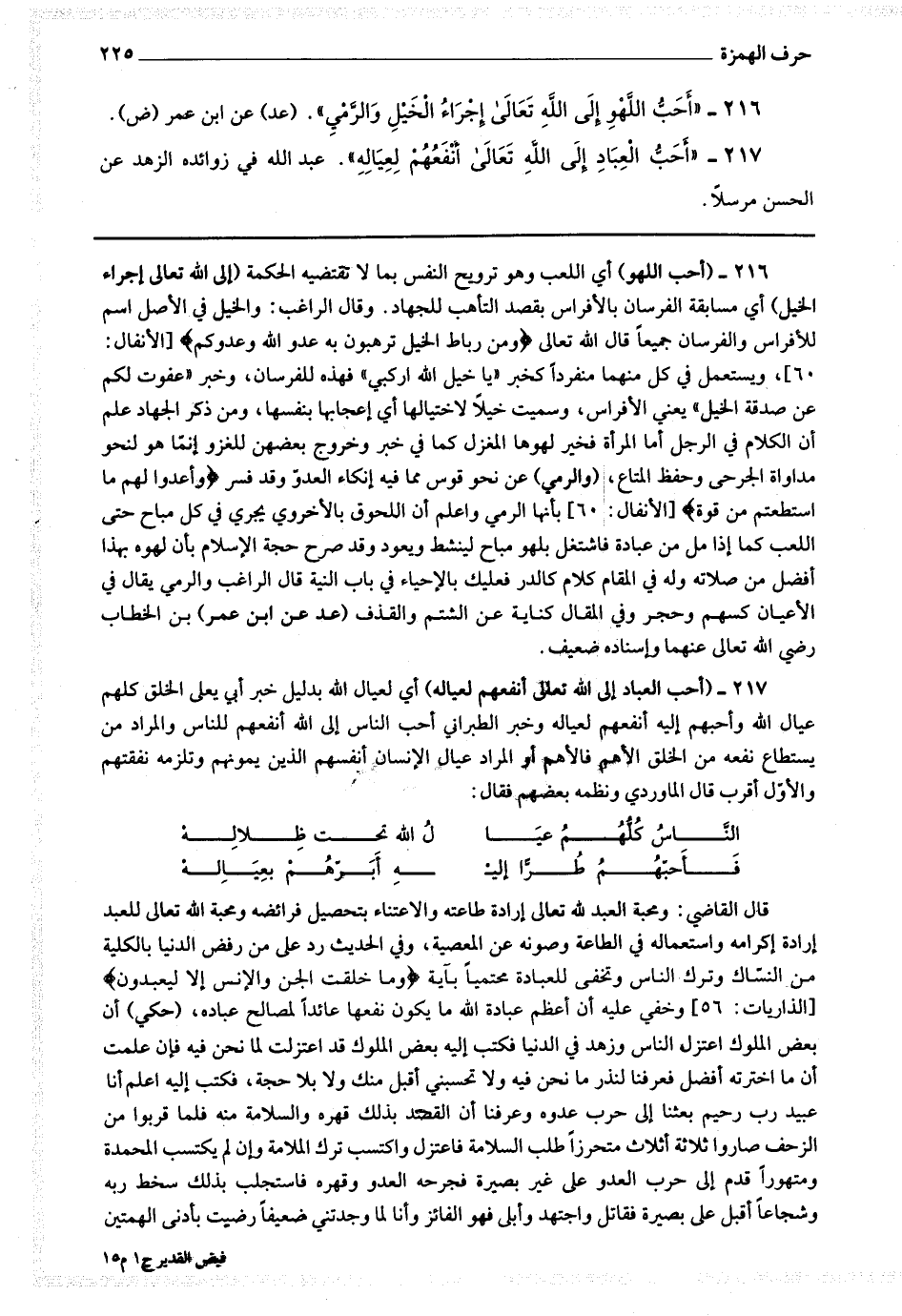 216 - (أحب اللهو) أي اللعب وهو ترويح النفس بما لا تقتضيه (إلى الله تعالى إجراء الخيل) أي مسابقة الفرسان بالأفراس بقصد التأهب للجهاد.