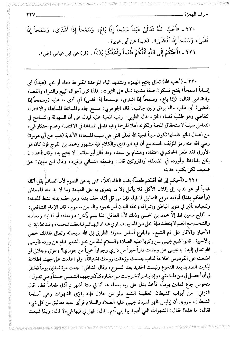 220 - (أحب الله) تعالى بفتح الهمزة وتشديد الباء الموحدة المفتوحة دعاء أو خبر (عبدا) أي إنسانا (سمحا) بفتح فسكون صفة مشبهة تدل على الثبوت ، فلذا كرر أحوال البيع والشراء والقضاء والتقاضي فقال (إذا باع ، وسمحا إذا اشترى ، وسمحا إذا قضى) أي أدى ما عليه (وسمحا إذا اقتضى) أي طلب ما له برفق ولين جانب.