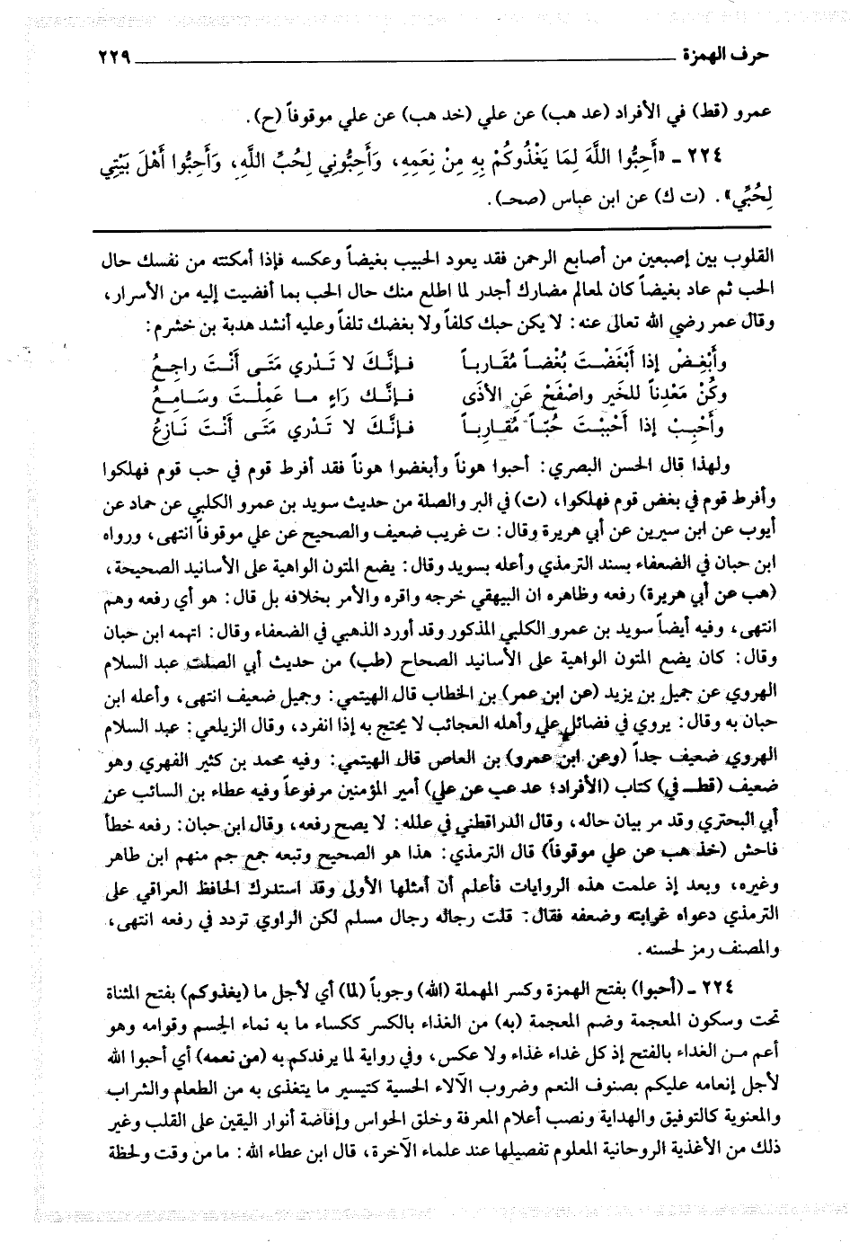 224 - (أحبوا) بفتح الهمزة وكسر المهملة (الله) وجوبا (لما) أي لأجل ما (يغذوكم) بفتح المثناة تحت وسكون المعجمة وضم المعجمة (به) من الغذاء بالكسر ككساء ما به نماء الجسم وقوامه وهو أعم من الغذاء بالفتح إذ كل غذاء غذاء ولا عكس وفي رواية لما يرفدكم به (من نعمه) أي أحبوا الله لأجل إنعامه عليكم بصنوف النعم وضروب الآلاء الحسية كتيسير ما يتغذى به من الطعام والشراب والمعنوية كالتوفيق والهداية ونصب أعلام المعرفة وخلق الحواس وإفاضة أنوار اليقين على القلب وغير ذلك من الأغذية الروحانية المعلوم تفصيلها عند علماء الآخرة قال ابن عطاء الله : مامن وقت ولحظة