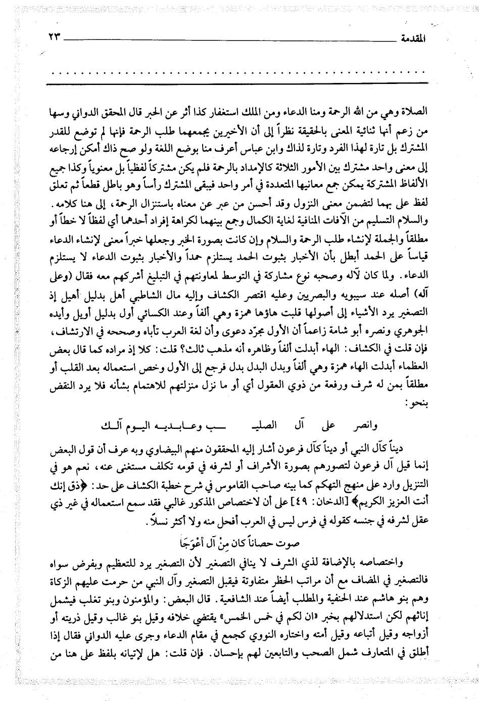 ولما كان لآله وصحبه نوع مشاركة في التوسط لمعاونتهم في التبليغ أشركهم معه فقال (وعلى آله) أصله عند سيبويه والبصريين وعليه اقتصر الكشاف وإليه مال الشاطبي إهل بدليل أهيل إذ التصغير يرد الأشياء إلى أصولها قلبت هاؤها همزة وهي ألفا وعند الكسائي أول بدليل أويل وأيده الجوهري ونصره أبو شامة زاعما أن الأول مجرد دعوى وأن لغة العرب تأباه وصححه في الإرتشاف ، فإن قلت في الكشاف : الهاء أبدلت ألفا وظاهره أنه مذهب ثالث ؟ قلت : كلا إذ مراده كما قال بعض العظماء أبدلت الهاء همزة وهي ألفا وبدل البدل بدل فرجع إلى الأول وخص استعماله بعد القلب أو مطلقا بمن له شرف ورفعة من ذوي العقول أي ما نزل منزلتهم للإهتمام بشأنه فلا يرد النقض بنحو : وانصر على آل الصليب وعابديه اليوم آلك دينا كآل النبي أو دينا كآل فرعون أشار إليه المحققون منهم البيضاوي وبه عرف أن قول البعض إنما قيل آل فرعون لتصورهم بصورة الأشراف أو لشرفه في قومه تكلف مستفنى عنه ، نعم هو في التنزيل وارد على منهج التهكم كما بينه صاحب القاموس في شرح خطبة الكشاف على حد : * (ذق إنك أنت العزيز الكريم) * على أن الاختصاص المذكور غالبي فقد سمع استعماله في غير ذي عقل لشرفه في جنسه كقوله في فرس ليس في العرب أفحل منه ولا أكثر نسلا.