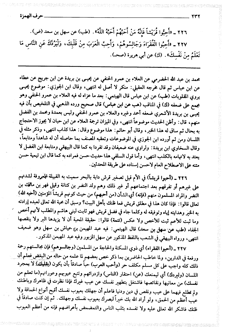 227 - (أحبوا الفقراء) أي ذوي المسكنة والحاجة من المسلمين (وجالسوهم) فإن مجالستهم رحمة ورفعة في الدارين ولما خاطب الحاضرين بما ذكر خص بعضهم لما علمه من حاله من البغض فعلم أن ذلك كله واجب على كل مسلم مكلف حر (وأحب العرب) حبا صادقا بأن يكون (بقلبك) لا بمجرد اللسان (وليردك) أي ليمنعك (عن) احتقار (الناس) وإزدرائهم وتتبع عيوبهم وعوراتهم (ما تعلم من نفسك) من معايبها ونقائصها فاشتغل بتطهير نفسك في ظاهرك وباطنك عن أقبح أنواع الحماقة ولا عيب أعظم من الحمق ولو أراد الله بك خيرا لبصرك بعيوب نفسك وجهلك.