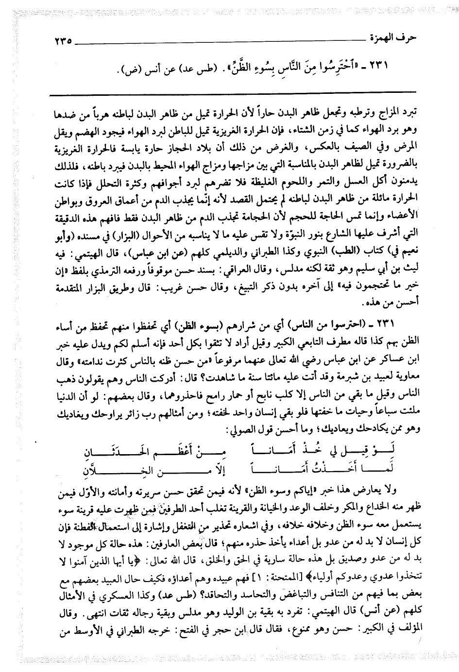 ليث بن أبي سليم وهو ثقة لكنه مدلس وقال العراقي بسند حسن موقوفا ورفعه الترمذي بلفظ إن خير ما تحتجمون فيه إلى آخره بدون ذكر التبيغ وقال حسن غريب قال وطريق البزار المتقدمة أحسن من هذه 231 - (احترسوا من الناس) أي من شرارهم (بسوء الظن) أي تحفظوا منهم تحفظ من أساء الظن بهم كذا قاله مطرف التابعي الكبير وقيل أراد لا تثقوا بكل أحد فإنه أسلم لكم ويدل عليه خبر ابن عساكر عن ابن عباس رضي الله تعالى عنهما مرفوعا من حسن ظنه بالناس كثرت ندامته وقال معاوية لعبيد بن شبرمة وقد أتت عليه مائتا سنة ما شاهدت ؟ قال أدركت الناس وهم يقولون ذهب الناس وقيل ما بقي من الناس إلا كلب نابح أو حمار رامح فاحذروهما وقال بعضهم لو أن الدنيا ملئت سباعا وحيات ما خفتها فلو بقي إنسان واحد لخفته ، ومن أمثالهم رب زائر يراوحك ويغاديك وهو ممن يكادحك ويعاديك ، وما أحسن قول الصولي : لو قيل لي خذ أمانا * من أعظم الحدثان لما أخذت أمانا * إلامن الخلان ولا يعارض هذا خبر إياكم وسوء الظن لأنه فيمن تحقق حسن سريرته وأمانته والأول فيمن ظهر منه الخداع والمكر وخلف الوعد والخيانة والقرينة تغلب أحد الطرفين فمن ظهرت عليه قرينة سوء يستعمل معه سوء الظن وخلافه خلافه ، وفي أشعاره تحذير من التغفل وإشارة إلى استعمال الفطنة فإن كل إنسان لا بد له من عدو بل أعداء يأخذ حذره منهم ، قال بعض العارفين هذه حالة كل موجود لا بد له من عدو وصديق بل هذه حالة سارية في الحق والخلق قال الله تعالى * (يا أيها الذين آمنوا لا تتخذوا عدوي وعدوكم أولياء) * فهم عبيده وهم أعداؤه فكيف حال العبيد بعضهم مع بعض بما فيهم من التنافس والتباغض والتحاسد والتحاقد ؟ (طس عد) وكذا العسكري في الأمثال كلهم (عن أنس) قال الهيتمي تفرد به بقية بن الوليد وهو مدلس وبقية رجاله ثقات انتهى.