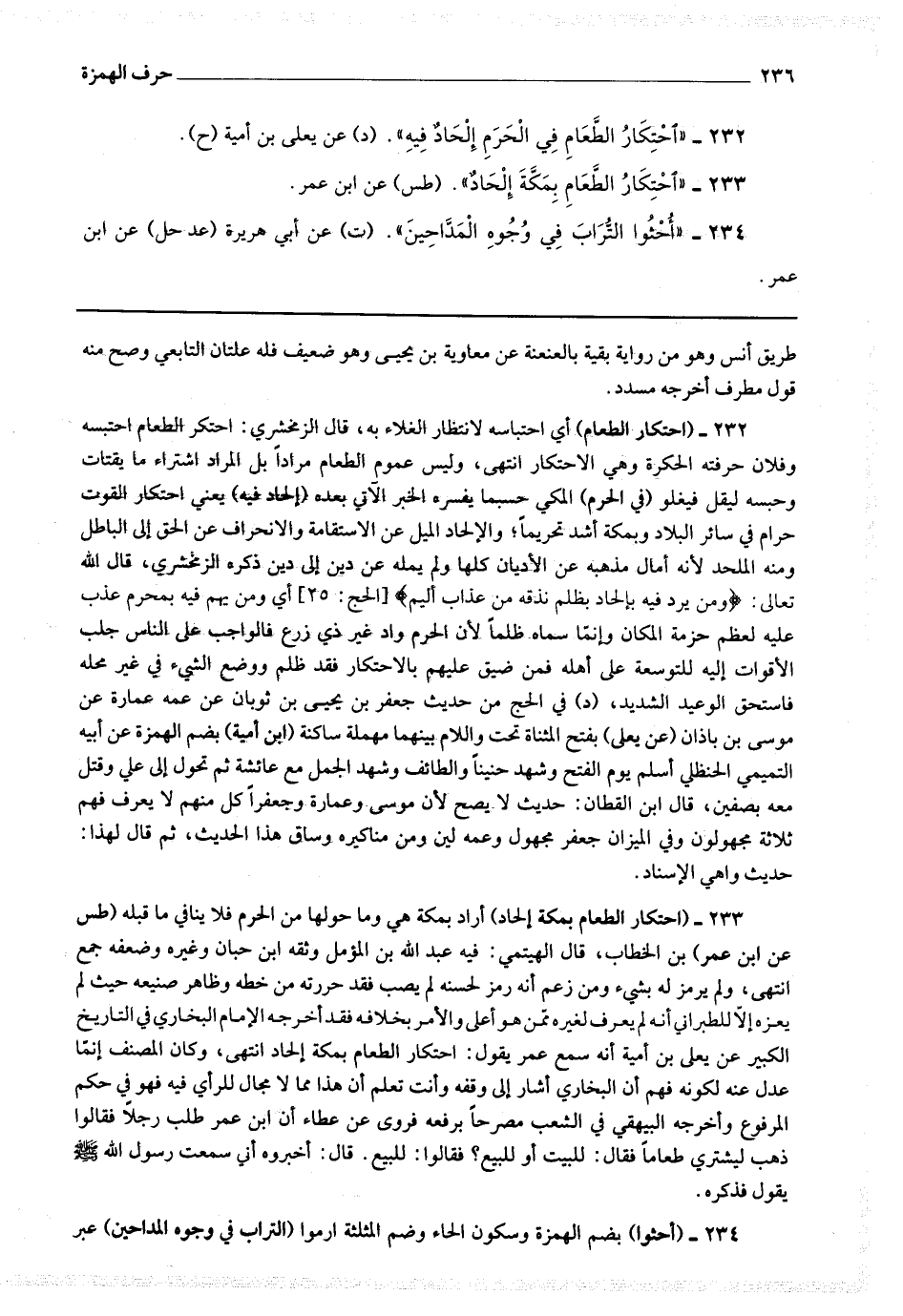 232 - (احتكار الطعام بمكة إلحاد) أراد بمكة هي وما حولها من الحرم فلا ينافي ما قبله.