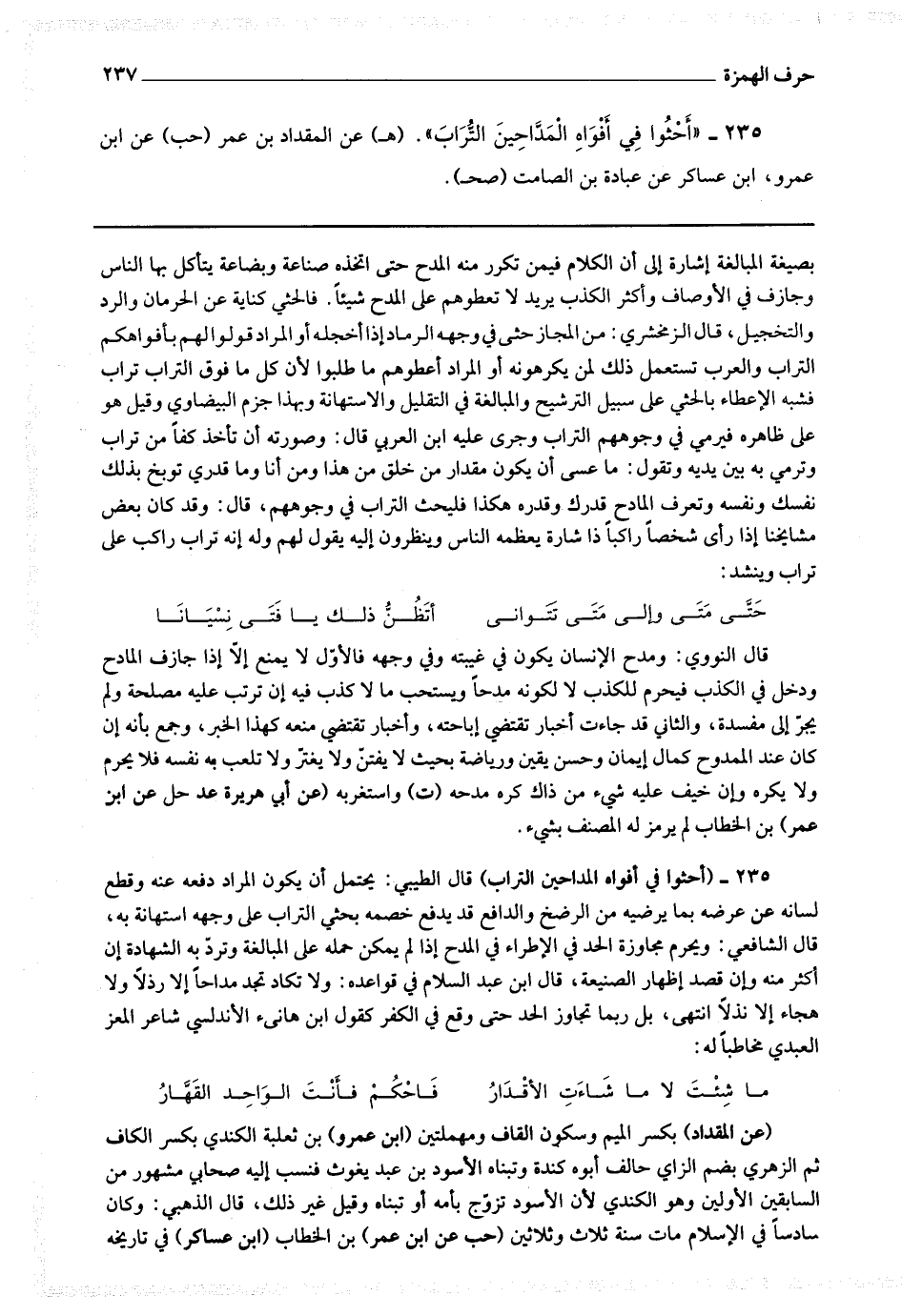 235 - (احثوا في أفواه المداحين التراب) قال الطيبي : يحتمل أن يكون المراد دفعه عنه وقطع لسانه عن عرضه بما يرضيه من الرضخ والدافع قد يدفع خصمه بحثي التراب على وجهه استهانة به قال الشافعية : ويحرم مجاوزة الحد في الإطراء في المدح إذا لم يكن حمله على المبالغة وترد به الشهادة إن أكثر منه وإن قصد إظهار الصنيعة قال ابن عبد السلام في قواعده ولا تكاد تجد مداحا إلا رذلا ولا هجاء إلا نذلا انتهى بل ربما تجاوز الحد حتى وقع في الكفر كقول ابن هاني الأندلسي شاعر المعز العبدي مخاطبا له : ما شئت لا ما شاءت الأقدار * فاحكم فأنت الواحد القهار (عن المقداد) بكسر الميم وسكون القاف ومهملتين (ابن عمرو) بن ثعلبة الكندي بكسر الكاف ثم الزهري بضم الزاي حالف أبوه كنده وتبناه الأسود بن عبد يغوث فنسب إليه صحابي مشهور من السابقين الأولين وهو الكندي لأن الأسود تزوج بأمه أو تبناه وقيل غير ذلك قال الذهبي وكان سادسا في الإسلام مات سنة ثلاث وثلاثين (حب عن ابن عمر) بن الخطاب (ابن عساكر) في تاريخه