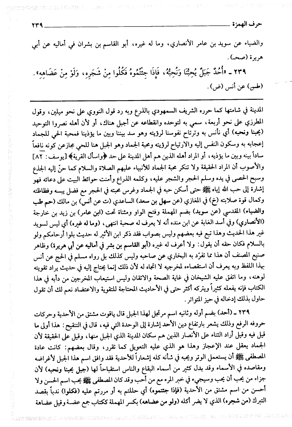 239 - (أحد) بضم أوله وثانيه اسم مرتجل لهذا الجبل قال ياقوت مشتق من الأحدية وحركات حروفه الرفع وذلك يشعر بارتفاع دين الأحد إشارة إلى الوحدة التي فيه قال في التنقيح هذا أولى ما قيل فيه وقيل أراد الثناء على الأنصار الذين هم سكان المدينة الذي الجبل منها وقيل على الحقيقة لأن الجماد يعقل عند الاعجاز وهذا هو الذي عليه التعويل كما تقرر وقال بعضهم كانت عادة المصطفى صلى الله عليه وسلم أن يستعمل الوتر ويحبه في شأنه كله إشعارا للأحدية فقد وافق اسم هذا الجبل لأغراضه ومقاصده في الأسماء وقد بدل كثير من أسماء البقاع والناس استقباحا لها (جبل يحبنا ونحبه) لأن جزاء من يحب أن يحب وسيجئ في خبر المرء مع من أحب وقد كان المصطفى صلى الله عليه وسلم يحب اسم الحسن ولا أحسن من اسم مشتق من الأحدية (فإذا جئتموه) أي حللتم به أو مررتم عليه (فكلوا) ندبا بقصد