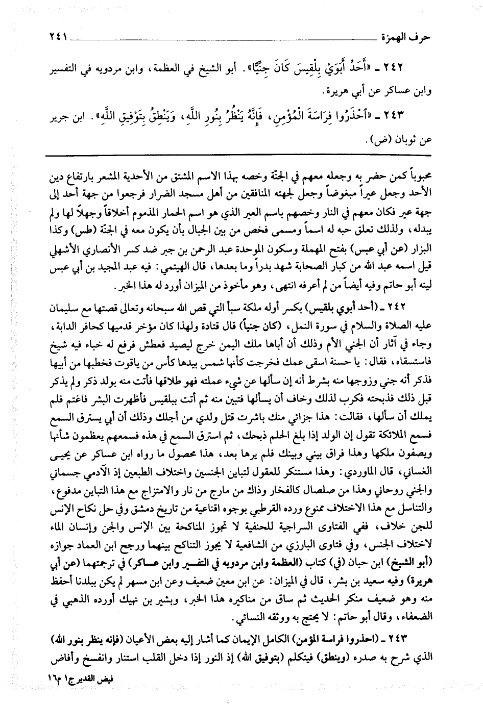 243 - (احذروا فراسة المؤمن) الكامل الإيمان كما أشار إليه بعض الأعيان (فإنه ينظر بنور الله) الذي شرح به صدره (وينطق) فيتكلم (بتوفيق الله) إذ النور إذا دخل القلب استنار وانفسح وأفاض