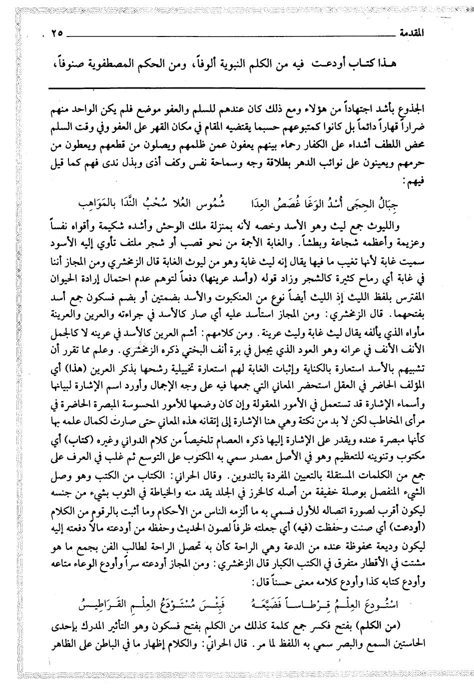 وعلم مما تقرر أن تشبيهم بالأسد استعارة بالكناية وإثبات الغابة لهم استعارة تخييلية رشحها بذكر العرين (هذا) أي المؤلف الحاضر في العقل استحضر المعاني التي جمعها فيه على وجه الإجمال وأورد اسم الإشارة لبيانها وأسماء الإشارة قد تستعمل في الأمور المعقولة وإن كان وضعها للأمور المحسوسة المبصرة الحاضرة في مرأى المخاطب لكن لا بد من نكتة وهي هنا الإشارة إلى إتقانه هذه المعاني حتى صارت لكمال علمه بها كأنها مبصرة عنده ويقدر على الإشارة إليها ذكره العصام تلخيصا من كلام الدواني وغيره (كتاب) أي مكتوب وتنوينه للتعظيم وهو في الأصل مصدر سمي به المكتوب على التوسع ثم غلب في العرف على حمع من الكلمات المستقلة بالتعيين المفردة بالتدوين.