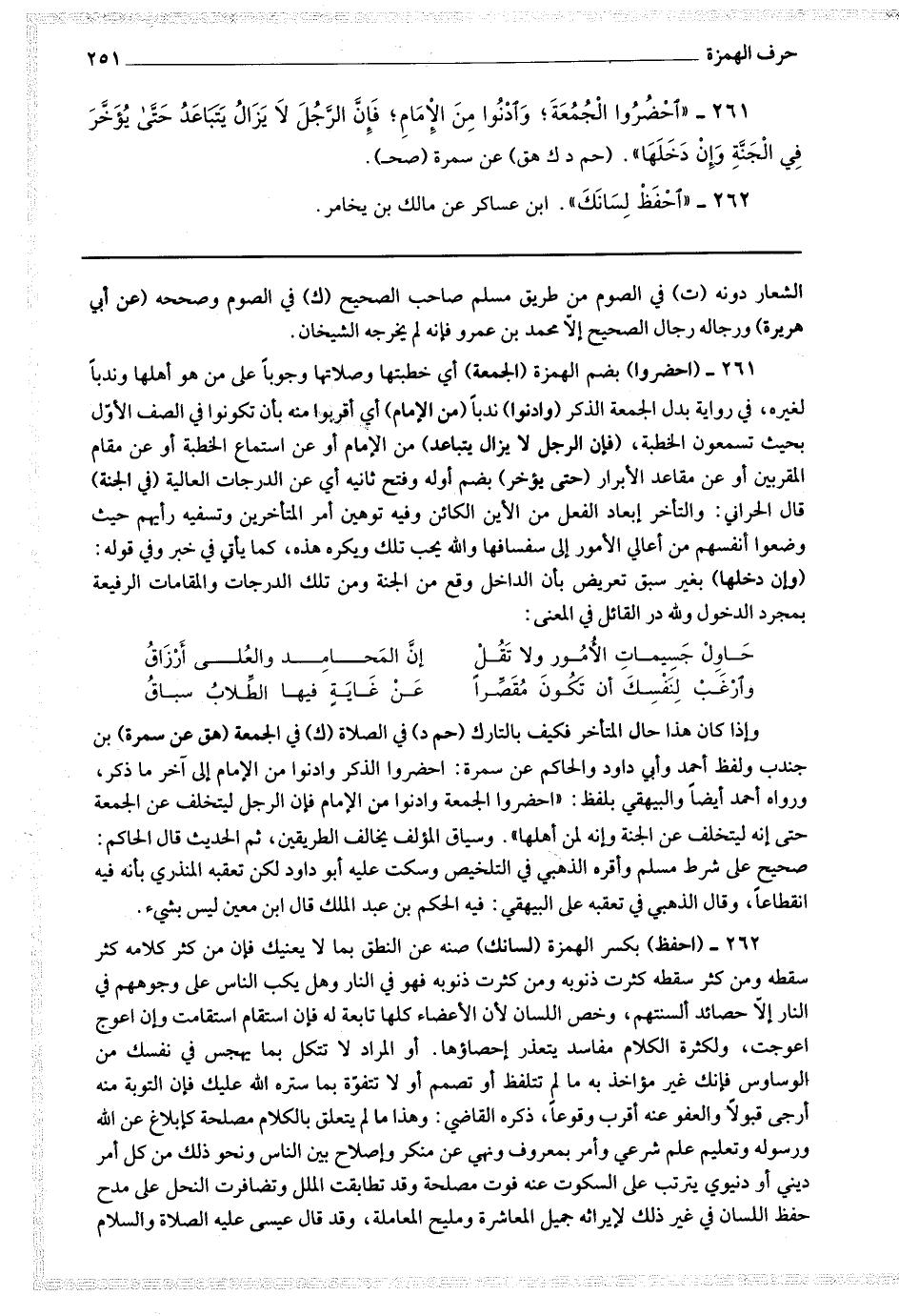 262 - (احفظ) بكسر الهمزة (لسانك) صنه عن النطق بما لا يعنيك فإن من كثر كلامه كثر سقطه ومن كثر سقطه كثرت ذنوبه ومن كثرت ذنوبه فهو في النار وهل يكب الناس على وجوههم في النار إلا حصائد ألسنتهم وخص اللسان لأن الأعضاء كلها تابعة له فإن استقام استقامت وإن اعوج اعوجت ولكثرة الكلام مفاسد يتعذر إحصاؤها أو المراد لا تتكلم بما يهجس في نفسك من الوساوس فإنك غير مؤاخذ به ما لم تتلفظ أو تصمم أو لا تتفوه بما ستره الله عليك فإن التوبة منه أرجى قبولا والعفو عنه أقرب وقوعا ذكره القاضي وهذا ما لم يتعلق بالكلام مصلحة كإبلاغ عن الله ورسوله وتعليم علم شرعي وأمر بمعروف ونهي عن منكر وإصلاح بين الناس ونحو ذلك من كل أمر ديني أو دنيوي يترتب على السكوت عنه فوت مصلحة وقد تطابقت الملل وتضافرت النحل على مدح حفظ اللسان في غير ذلك لإيراثه جميل المعاشرة ومليح المعاملة وقد قال عيسى عليه الصلاة والسلام