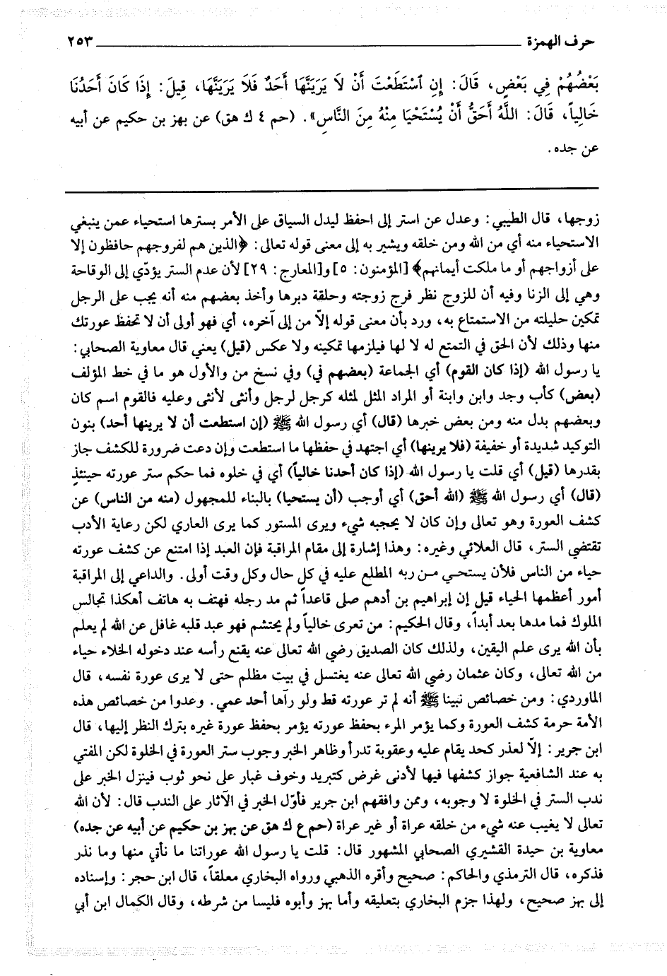 منها وذاك لأن الحق في التمتع له لا لها فيلزمها تمكينه ولا عكس (قيل) يعني قال معاوية الصحابي يا رسول الله (إذا كان القوم) أي الجماعة (بعضهم في) وفي نسخ من والأول هو ما في خط المؤلف (بعض) كأب وجد وابن وابنة أو المراد المثل لمثله كرجل لرجل وأنثى لأنثى وعليه فالقوم اسم كان وبعضهم بدل منه ومن بعض خبرها (قال) أي رسول الله صلى الله عليه وسلم (إن استطعت أن لا يرينها أحدا) بنون التوكيد شديدة أو خفيفة فلا يريها أحد اجتهد في حفظها ما استطعت وإن دعت ضرورة للكشف جاز بقدرها (قيل) أي قلت يا رسول الله (إذا كان أحدنا خاليا) أي في خلوة فما حكم ستر عورته حينئذ (قال) أي رسول الله صلى الله عليه وسلم (الله أحق) أي أوجب (أن يستحيا) بالبناء للمجهول (منه من الناس) عن كشف العورة وهو تعالى وإن كان لا يحجبه شئ ويرى المستور كما يرى العاري لكن رعاية الأدب تقتضي الستر قال العلائي وغيره وهذا إشارة إلى مقام المراقبة فإن العبد إذا امتنع عن كشف عورته حياء من الناس فلأن يستحيي من ربه المطلع عليه في كل حال وكل وقت أولى والداعي إلى المراقبة أمور أعظمها الحياء قيل إن إبراهيم بن أدهم صلى قاعدا ثم مد رجله فهتف به هاتف أهكذا تجالس الملوك فما مدها بعد أبدا وقال الحكيم من تعرى خاليا ولم يحتشم فهو عبد قلبه غافل عن الله لم يعلم بأن الله يرى علم اليقين ولذلك كان الصديق رضي الله تعالى عنه يقنع رأسه عند دخوله الخلاء حياء من الله تعالى وكان عثمان رضي الله تعالى عنه يغتسل في بيت مظلم حتى لا يرى عورة نفسه قال الماوردي ومن خصائص نبينا صلى الله عليه وسلم أنه لم تر عورته قط ولو رآها أحد عمي وعدوا من خصائص هذه الأمة حرمة كشف العورة وكما يؤمر بحفظ عورته يؤمر بحفظ عورة غيره بترك النظر إليها قال ابن جرير إلا لعذر كحد يقام عليه وعقوبة تدرأ وظاهر الخبر وجوب ستر العورة في الخلوة لكن المفتى به عند الشافعية جواز كشفها فيها لأدنى غرض كتبريد وخوف غبار على نحو ثوب فينزل الخبر على ندب الستر في الخلوة لا وجوبه وممن وافقهم ابن جرير فأول الخبر في الآثار على الندب قال : لأن الله تعالى لا يغيب عنه شئمن خلقه عراة أو غير عراة.
