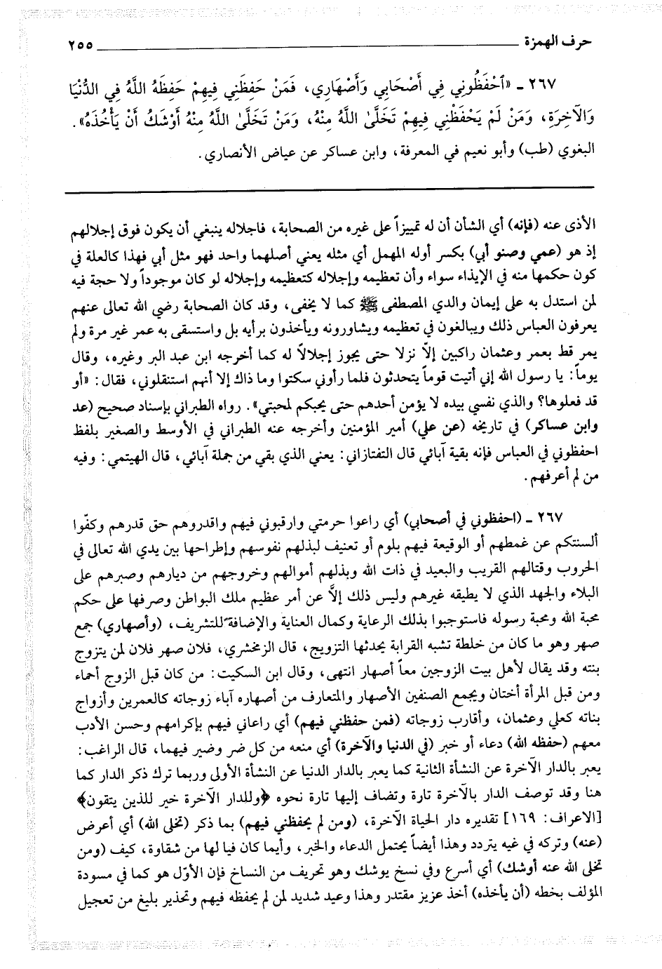 267 - (احفظوني في أصحابي) أي راعوا حرمتي وارقبوني فيهم واقدروهم حق قدرهم وكفوا ألسنتكم عن غمطهم أو الوقيعة فيهم بلوم أو تعنيف لبذلهم نفوسهم وإطراحها بين يدي الله تعالى في