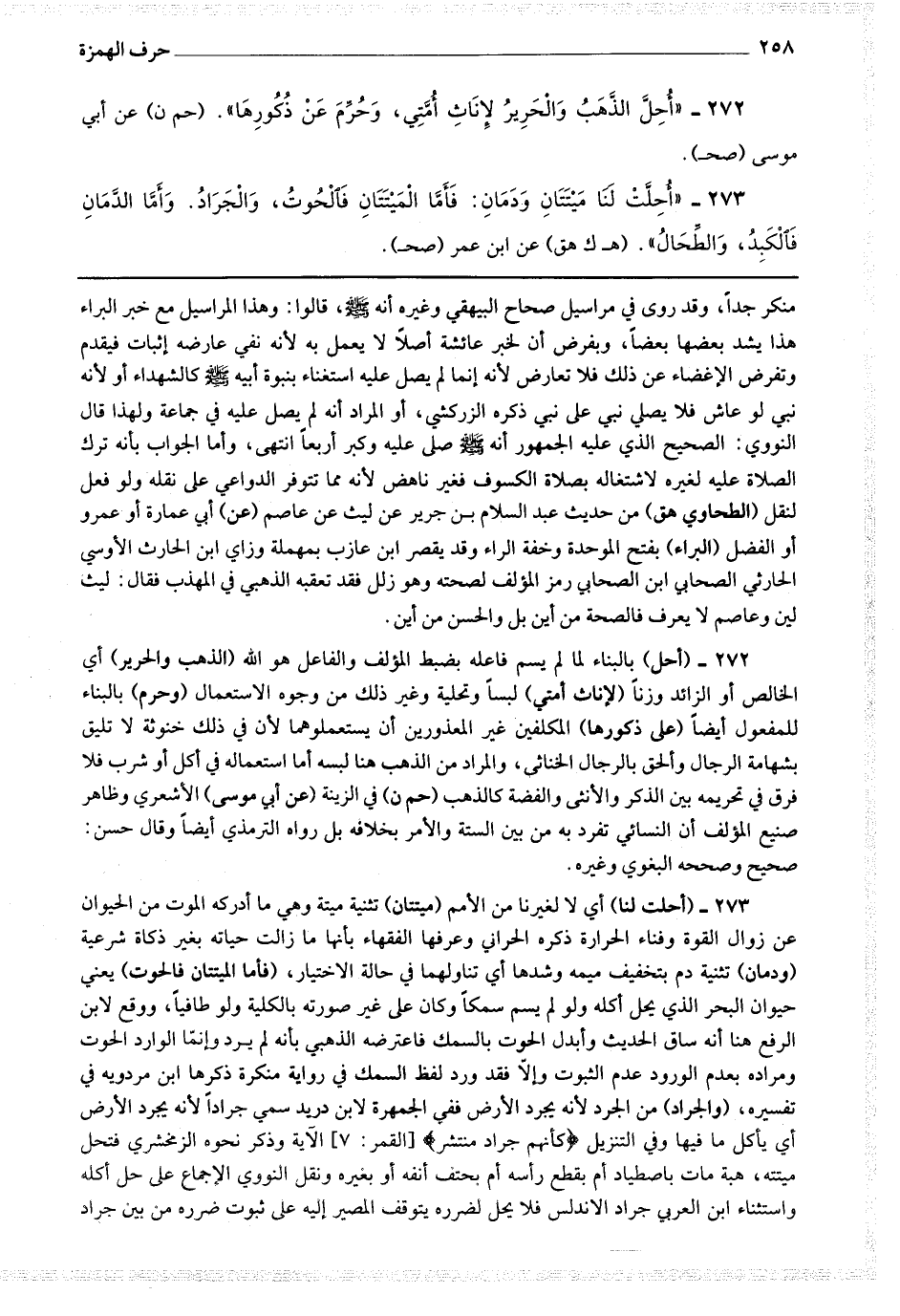 273 - أحلت لنا) أي لا لغيرنا من الأمم (ميتتان) تثنية ميتة وهي ما أدركه الموت من الحيوان عن زوال القوة وفناء الحرارة ذكره الحراني وعرفها الفقهاء بأنها ما زالت حياته بغير ذكاة شرعية (ودمان) تثنية دم بتخفيف ميمه وشدها أي تناولهما في حالة الاختيار (فأما الميتتان فالحوت) يعني حيوان البحر الذي يحل أكله ولو لم يسم سمكا وكان على غير صورته بالكلية ولو طافيا ووفع لابن الرفعة هنا أنه ساق الحديث وأبدل الحوت بالسمك فاعترضه الذهبي بأنه لم يرد وإنما الوارد الحوت ومراده بعدم الورود عدم الثبوت وإلا فقد ورد لفظ السمك في رواية منكرة ذكرها ابن مردويه في تفسيره (والجراد) من الجرد لأنه يجرد الأرض ففي الجمهرة لابن دريد سمي جرادا لأنه يجرد الأرض أي يأكل ما فيها وفي التنزيل * (كأنهم جراد منتشر) * الآية وذكر نحوه الزمخشري فتحل ميتته ، هبه مات باصطياد أم بقطع رأسه أم بحتف أنفه الاجمال على حل أكله فلا يحل لضرورة يتوقف المصير إليه على ثبوت ضرره من بين جراد