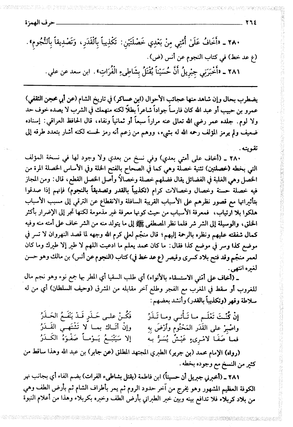 281 - (أخبرني جبريل أن حسينا) ابن فاطمة يقتل بشاطئ الفرات) بضم الفاء أي بجانب نهر الكوفة العظيم المشهور وهو يخرج من آخر حدود الروم ثم يمر بأطراف الشام ثم بأرض الطف وهي من بلاد كربلاء فلا تدافع بينه وبين خبر الطبراني بأرض الطف وخبره بكربلاء وهذا من أعلام النبوة