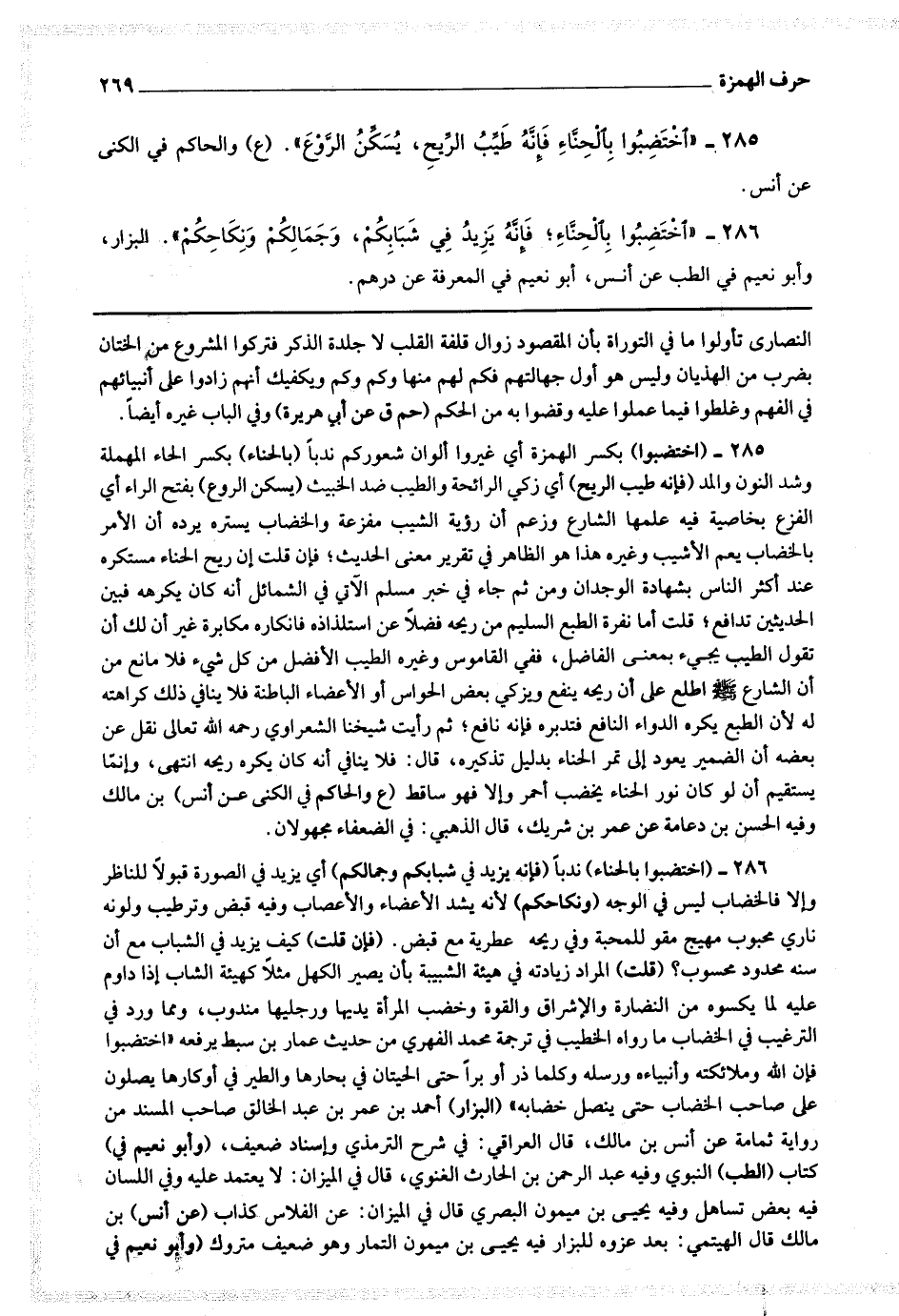 285 - (اختضبوا) بكسر الهمزة أي غيروا ألوان شعوركم ندبا (بالحناء) بكسر الحاء المهملة وشد النون والمد (فإنه طيب الريح) أي زكي الرائحة والطيب ضد الخبيث (يسكن الروع) بفتح الراء أي الفزع بخاصية فيه علمها الشارع وزعم أن رؤية الشيب مفزعة والخضاب يستره يرده أن الأمر بالخضاب يعم الأشيب وغيره هذا هو الظاهر في تقرير معنى الحديث ، فإن قلت : إن ريح الحناء مستكره عند أكثر الناس بشهادة الوجدان ومن ثم جاء في خبر مسلم الآتي في الشمائل أنه كان يكرهه فبين الحديثين تدافع ، قلت : أما نفرة الطبع السليم من ريحه فضلا عن استلذاذه فإنكاره مكابرة غير أن لك أن تقول الطيب يجئ بمعنى الفاضل ففي القاموس وغيره الطيب الأفضل من كل شئ فلا مانع من أن الشارع صلى الله عليه وسلم اطلع على أن ريحه ينفع ويزكي بعض الحواس أو الأعضاء الباطنة فلا ينافي ذلك كراهته له لأن الطبع يكره الدواء النافع فتدبره فإنه نافع ، ثم رأيت شيخنا الشعراوي رحمه الله تعالى نقل عن بعضهم أن الضمير يعود إلى تمر الحناء بدليل تذكيره قال : فلا ينافي أنه كان يكره ريحه انتهى وإنما يستقيم أن لو كان نور الحناء يخضب أحمر وإلا فهو ساقط (ع والحاكم في الكنى عن أنس) بن مالك وفيه الحسن بن دعامة عن عمر بن شريك قال الذهبي في الضعفاء مجهولان.