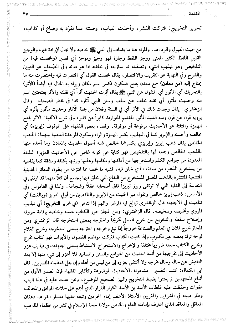 قال الزمخشري ومن المجاز خرج فلان في العلم والصناعة خروجا إذا نبغ وخرجه واخترجه بمعنى استخرجه وخرج الغلام لوحه ترك بعضه غير مكتوب وإذا كتبت الكتاب فتركت مواضع الفصول والأبواب فهو كتاب مخرج وخرج الكتاب جعله ضروبا مختلفة والإخراج والاستخراج الاستنباط بمعنى اجتهدت في تهذيب عزو الأحاديث إلى مخرجيها من أئمة الحديث من الجوامع والسنن والمسانيد فلا أعزو إلى شئ منها إلا بعد التفتيش عن حاله وحال مخرجه ولا أكتفي بعزوه إلى من ليس من أهله وإن جل كعظماء المفسرين.