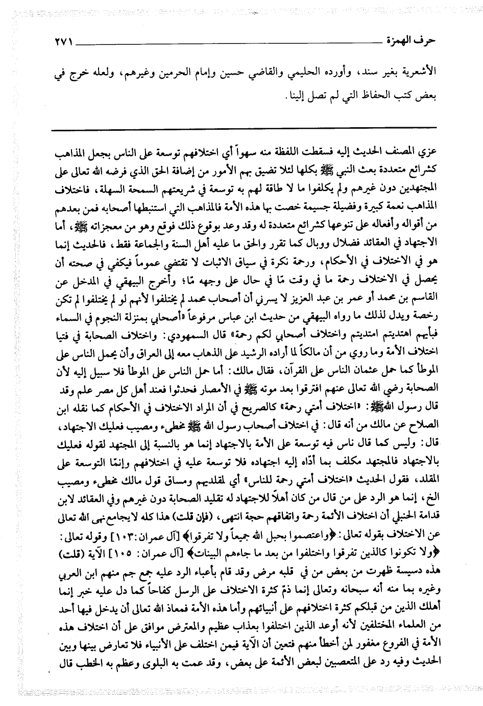 [ فإن قلت ] هذا كله لا يجامع نهى الله تعالى عن الاختلاف بقوله تعالى * (واعتصموا بحبل الله جميعا ولا تفرقوا) * وقوله تعالى * (ولا تكونوا كالذين تفرقوا واختلفوا من بعد ما جاءهم البينات) * الآية [ قلت ] هذه دسيسة ظهرت من بعض من في قلبه مرض وقد قام بأعباء الرد عليه جمع جم منهم ابن العربي وغيره بما منه أنه سبحانه وتعالى إنما ذم كثرة الاختلاف على الرسل كفاحا كما دل عليه خبر إنما أهلك الذين من قبلكم كثرة اختلافهم على أنبيائهم وأما هذه الأمة فمعاذ الله تعالى أن يدخل فيها أحد