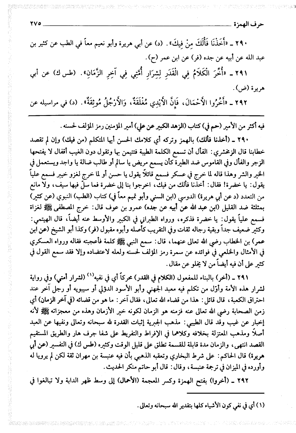 291 - (أخر) بالبناء للمفعول (الكلام في القدر) محركا أي في نفيه (أي في نفي كون الأشياء كلها بتقدير الله سبحانه وتعالى) (لشرار أمتي) وفي رواية لشرار هذه الأمة وأول من تكلم فيه معبد الجهني وأبو الأسود الدؤلي أو سيبويه أو رجل آخر عند احتراق الكعبة فقال قائل هذا من قضاء الله تعالى فقال آخر ما هو من قضائه (في آخر الزمان) أي زمن الصحابة رضي الله تعالى عنهم فزمنهم هو الزمان لكونه خير الأزمان وهذه من معجزاته صلى الله عليه وسلم لأنه إخبار عن غيب وقع قال الطيبي : مذهب الجبرية إثبات القدرة لله سبحانه وتعالى ونفيها عن العبد أصلا ومذهب المعتزلة بخلافه وكلاهما في الإفراط والتفريط على شفا جرف هار والطريق المستقيم القصد انتهى والزمان مدة قابلة للقسمة تطلق على قليل الوقت وكثيره (طس ك) في التفسير (عن أبي هريرة) قال الحاكم على شرط البخاري وتعقبه الذهبي بأن فيه عنبسة بن مهران ثقة لكن لم يرويا له وأورده في الميزان في ترجمة عنبسة وقال قال أبو حاتم منكر الحديث.
