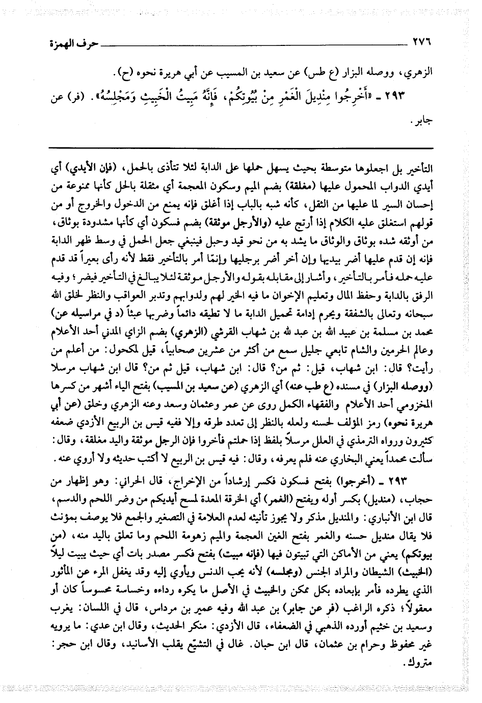سبحانه وتعالى بالشفقة ويحرم إدامة تحميل الدابة ما لا تطيقه دائما وضربها عبثا (د في مراسيله عن) محمد بن مسلمة بن عبيد الله بن عبد الله بن شهاب القرشي (الزهري) بضم الزاي المدني أحد الأعلام وعالم الحرمين والشام تابعي جليل سمع من أكثر من عشرين صحابيا قيل لمكحول : من أعلم من رأيت قال : ابن شهاب قيل : ثم من قال : ابن شهاب قيل : ثم من ؟ قال : ابن شهاب مرسلا (ووصله البزار) في مسنده (ع طب عنه) أي الزهري (عن سعيد بن المسيب) بفتح الياء أشهر من كسرها المخزومي أحد الأعلام والفقهاء الكمل روى عن عمر وعثمان وسعد وعنه الزهري وخلق (عن أبي هريرة نحوه رمز المؤلف لحسنه ولعله بالنظر إلى تعدد طرقه وإلا ففيه قيس بن الربيع الأزدي ضعفه كثيرون ورواه الترمذي في العلل مرسلا بلفظ إذا حملتم فأخروا فإن الرجل موثقة واليد مغلقة وقال : سألت محمدا يعني البخاري عنه فلم يعرفه وقال فيه قيس بن الربيع لا أكتب حديثه ولا أروي عنه.
