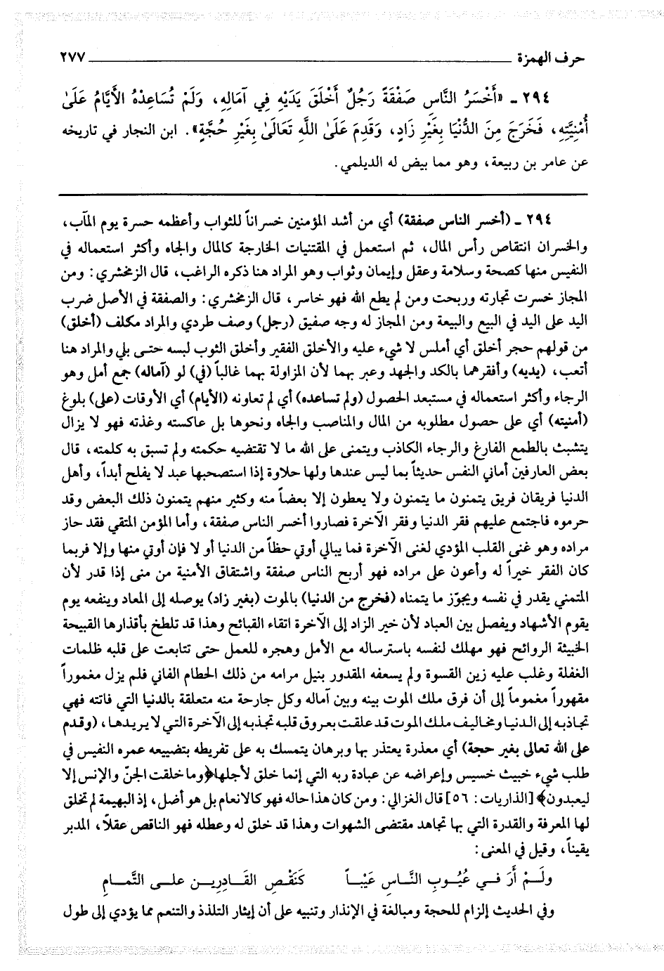 294 - (أخسر الناس صفقة) أي من أشد المؤمنين خسرانا للثواب وأعظمهم حسرة يوم المآب ،