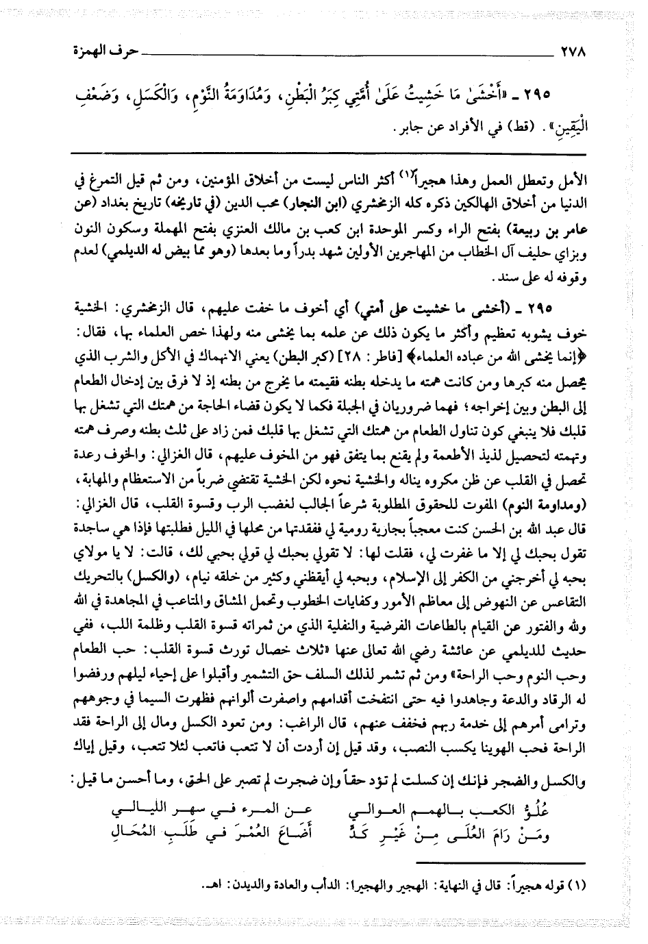 تقول بحبك لي إلا ما غفرت لي فقلت لها لا تقولي بحبك لي وقولي بحبي لك قالت لا يا مولاي بحبه لي أخرجني من الكفر إلى الاسلام وبحبه لي أيقظني وكثير من خلقه نيام (والكسل) بالتحريك التقاعس عن النهوض إلى معاظم الأمور وكفايات الخطوب وتحمل المشاق والمتاعب في المجاهدة في الله ولله والفتور عن القيام بالطاعات الفرضية والنفلية الذي من ثمراته قسوة القلب وظلمة اللب ففي الحديث للديلمي عن عائشة رضي الله تعالى عنها ثلاث خصال تورث قسوة القلب حب الطعام وحب النوم وحب الراحة ، ومن ثم تشمر لذلك السلف حق التشمير وأقبلوا على إحياء ليلهم ورفضوا له الرقاد والدعة وجاهدوا فيه حتى انتفخت أقدامهم واصفرت ألوانهم فظهرت السيما في وجوههم وترامى أمرهم إلى خدمة ربهم فخفف عنهم.