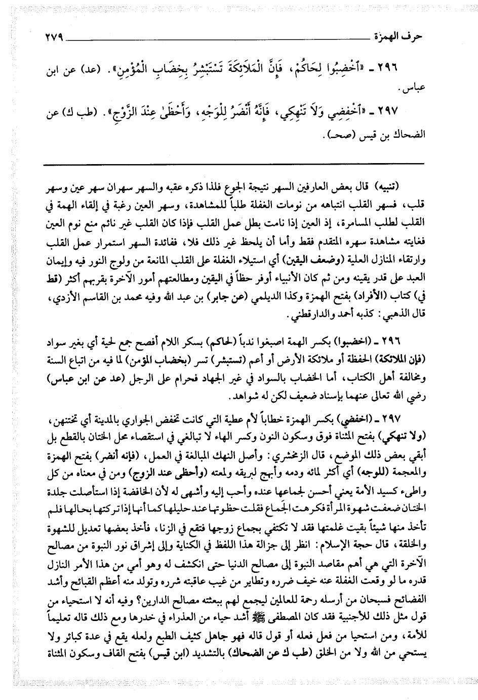 296 - (اخضبوا) بكسر الهمزة اصبغوا ندبا (لحاكم) بكسر اللام أفصح جمع لحية أي بغير سواد (فإن الملائكة) الحفظة أو ملائكة الأرض أو أعم (تستبشر) تسر (بخضاب المؤمن) لما فيه من اتباع السنة ومخالفة أهل الكتاب أما الخضاب بالسواد في غير الجهاد فحرام على الرجل.