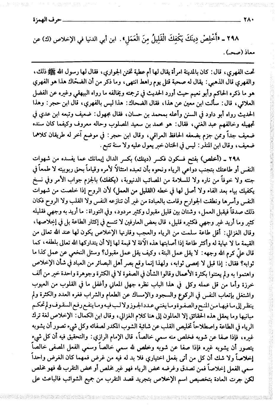 298 - (أخلص) بفتح فسكون فكسر (دينك) بكسر الدال إيمانك عما يفسده من شهوات النفس أو طاعتك بتجنب دواعي الرياء ونحوه بأن تعبده امتثالا لأمره وقياما بحق ربوبيته لا طمعا في جنته ولا خوفا من ناره ولا للسلامة من المصائب الدنيوية (يكفك) بالجزم جواب الأمر وفي نسخ يكفيك بياء بعد الفاء ولا أصل لها في خطه (القليل من العمل) لأن الروح إذا خلصت من شهوات النفس وأسرها ونطقت الجوارح وقامت بالعبادة من غير أن تنازعه النفس ولا القلب ولا الروح فكان ذلك صدقا فيقبل العمل وشتان بين قليل مقبول وكثير مردود ، وفي التوراة : ما أريد به وجهي فقليله كثير وما أريد غير وجهي فكثيره قليل ، قال بعض العارفين لا تتسع في إكثار الطاعة بل في إخلاصها وقال الغزالي : أقل طاعة سلمت من الرياء والعجب وقارنها الإخلاص بكون لها عند الله تعالى من القيمة ما لا نهاية له وأكثر طاعة إذا أصابتها هذه الآفة لا قيمة لها إلا أن يتداركها الله تعالى بلطفه كما قال علي كرم الله وجهه : لا يقل عمل البتة ، وكيف يقل عمل مقبول ؟ وسئل النخعي عن عمل كذا ما ثوابه فقال إذا قبل لا يحصى ثوابه ولهذا إنما وقع بصر أهل البصائر من العباد في شأن الإخلاص واهتموا به ولم يعتنوا بكثرة الأعمال وقالوا الشأن في الصفوة لا في الكثرة وجوهرة واحدة خير من ألف خرزة وأما من قل عمله وكل في هذا الباب نظره جهل المعاني وأغفل ما في القلوب من العيوب واشتغل بإتعاب النفس في الركوع والسجود والإمساك عن الطعام والشراب فغره العدد والكثرة ولم ينظر إلى ما فيها من المنح والصفوة وما يغني عدد الجوز ولا لب فيه وما ينفع رفع السقوف ولم تحكم مبانيها وما يعقل هذه الحقائق إلا العالمون إلى هنا كلام الغزالي ، وقال ابن الكمال : الإخلاص لغة ترك الرياء في الطاعة واصطلاحا تخليص القلب عن شائبة الشوب المكدر لصفائه وكل شئ