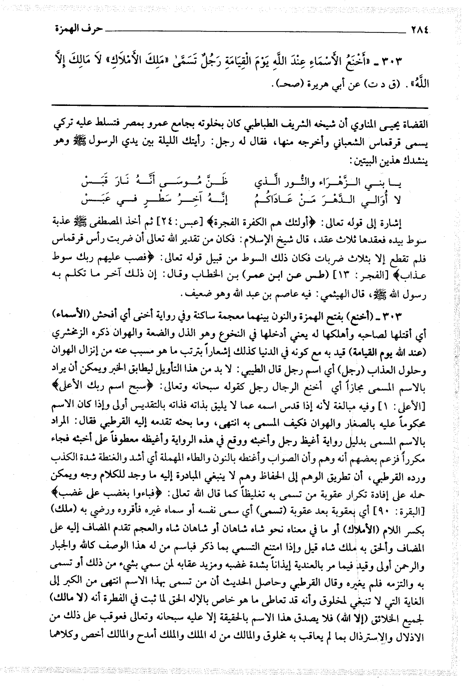 303 - (أخنع) بفتح الهمزة والنون بينهما معجمة ساكنة وفي رواية أخنى أي أفحش (الأسماء) أي أقتلها لصاحبه وأهلكها له يعني أدخلها في النخوع وهو الذل والضعة والهوان ذكره الزمخشري (عند الله يوم القيامة) قيد به مع كونه في الدنيا كذلك إشعارا بترتب ما هو مسبب عنه من إنزال الهوان وحلول العذاب (رجل) أي اسم رجل قال الطيبي : لا بد من هذا التأويل ليطابق الخبر ويمكن أن يراد بالاسم المسمى مجازا أي أخنع الرجال رجل كقوله سبحانه وتعالى * (سبح اسم ربك الأعلى) * وفيه مبالغة لأنه إذا قدس اسمه عما لا يليق بذاته فذاته بالتقديس أولى وإذا كان الاسم محكوما عليه بالصغار والهوان فكيف المسمى به انتهى وما بحثه تقدمه إليه القرطبي فقال المراد