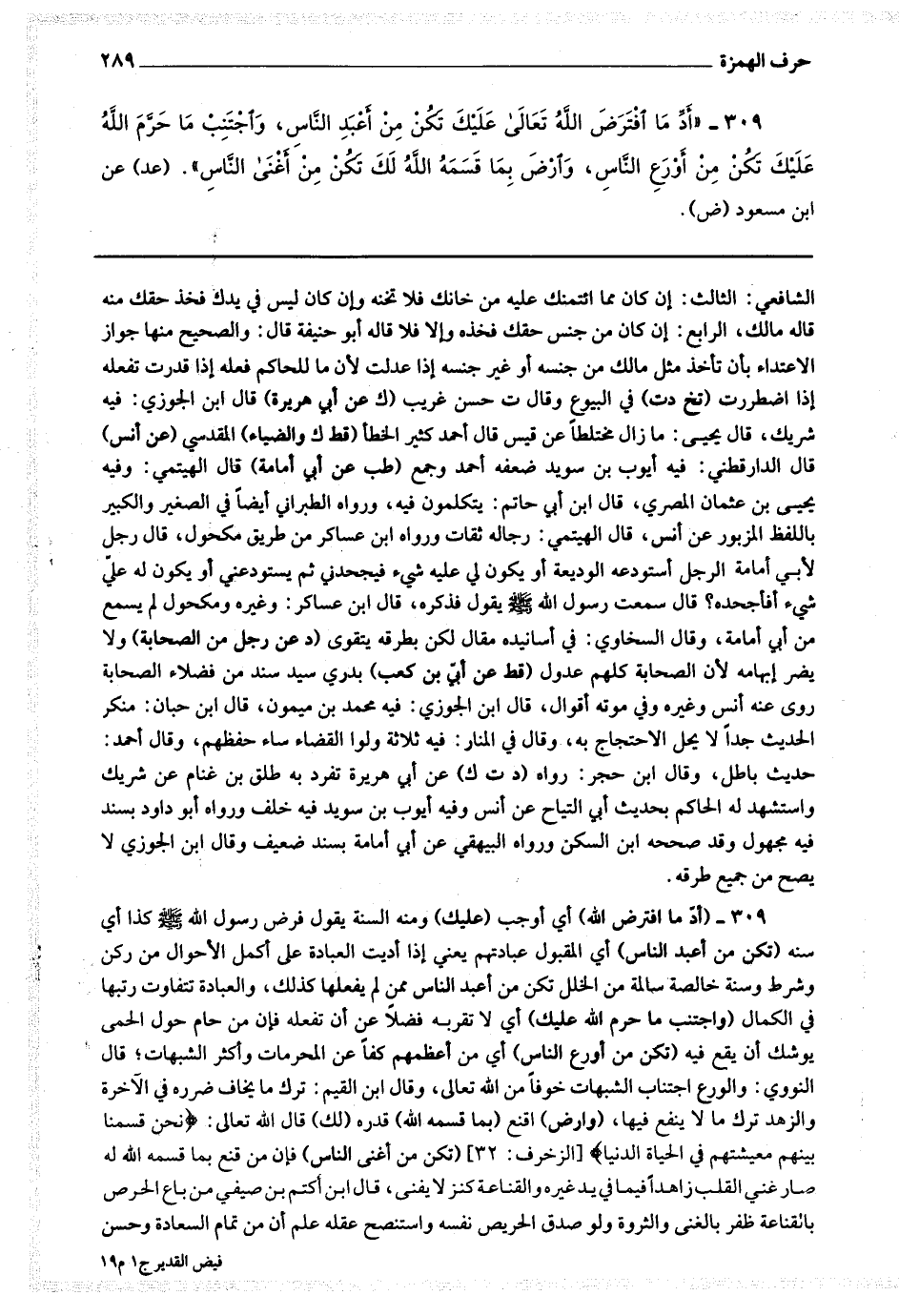 309 - (أد ما افترض الله) أي أوجب (عليك) ومنه السنة يقول فرض رسول الله صلى الله عليه وسلم كذا أي سنه (تكن من أعبد الناس) أي المقبول عبادتهم يعني إذا أديت العبادة على أكمل الأحوال من ركن وشرط وسنة خالصة سالمة من الخلل تكن من أعبد الناس ممن لم يفعلها كذلك والعبادة تتفاوت رتبها في الكمال (واجتنب ما حرم الله عليك) أي لا تقربه فضلا عن أن نفعله فإن من حام حول الحمى أوشك أن يقع فيها (تكن من أورع الناس) أي من أعظمهم كفا عن المحرمات وأكثر الشبهات ، قال النووي : والورع اجتناب الشبهات خوفا من الله تعالى وقال ابن القيم : ترك ما يخاف ضرره في الآخرة