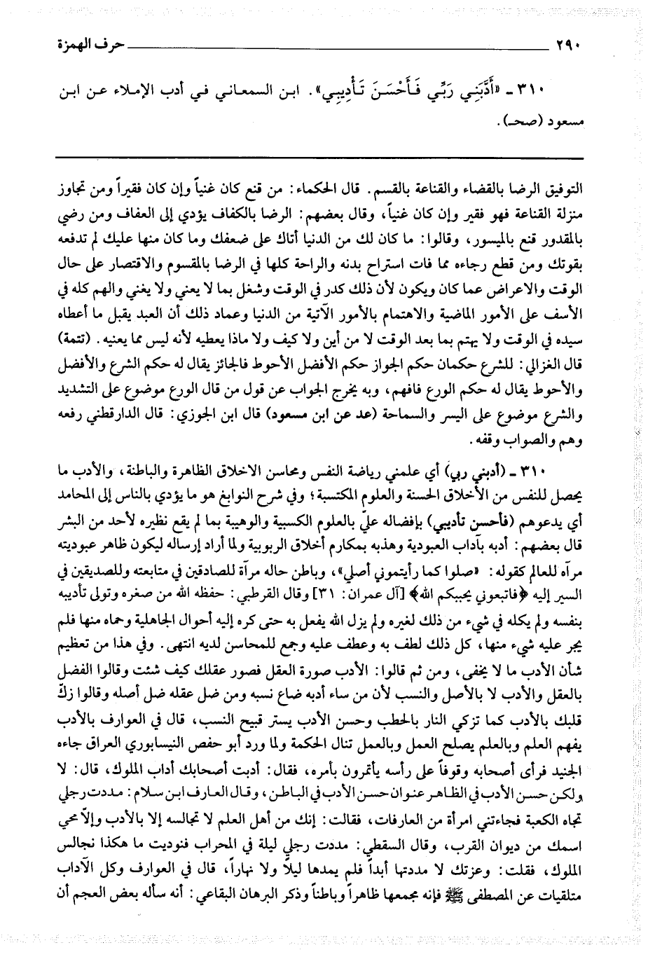 310 - (أدبني ربي) أي علمني رياضة النفس ومحاسن الأخلاق الظاهرة والباطنة ، والأدب ما يحصل للنفس من الأخلاق الحسنة والعلوم المكتسبة ، وفي شرح النوابغ هو ما يؤدي بالناس إلى المحامد أي يدعوهم (فأحسن تأديبي) بإفضاله علي بالعلوم الكسبية والوهبية بما لم يقع نظيره لأحد من البشر قال بعضهم : أدبه بآداب العبودية وهذبه بمكارم أخلاق الربوبية ولما أراد إرساله ليكون ظاهر عبوديته مرآة للعالم كقوله صلوا كما رأيتموني أصلي وباطن حاله مرآة للصادقين في متابعته وللصديقين في السير إليه * (فاتبعوني يحببكم الله) * وقال القرطبي : حفظه الله من صغره وتولى تأديبه