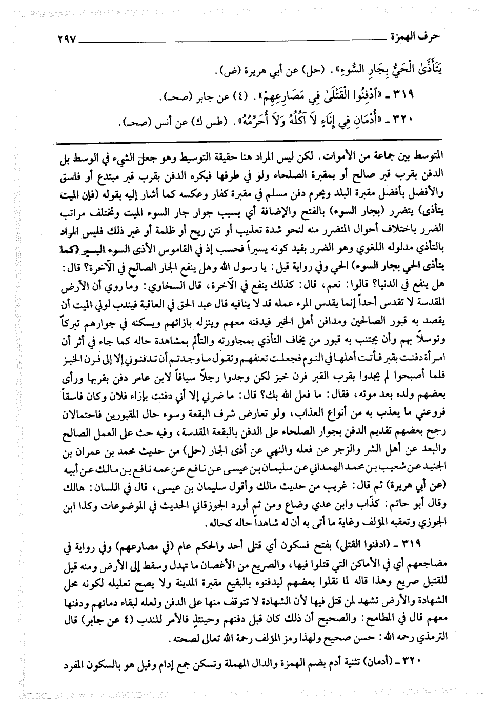 319 - (ادفنوا القتلى) بفتح فسكون أي قتلى أحد والحكم عام (في مصارعهم) وفي رواية في مضاجعهم أي في الأماكن التي قتلوا فيها ، والصريع من الأغصان ما تهدل وسقط إلى الأرض ومنه قيل للقتيل صريع وهذا قاله لما نقلوا بعضهم ليدفنوه بالبقيع مقبرة المدينة ولا يصح تعليله لكونه محل الشهادة والأرض تشهد لمن قتل فيها لأن الشهادة لا تتوقف منها على الدفن ولعله لبقاء دمائهم ودفنها معهم قال في المطامح والصحيح أن ذلك كان قبل دفنهم وحينئذ فالأمر للندب (4 عن جابر) قال الترمذي رحمه الله حسن صحيح ولهذا رمز المؤلف رحمه الله تعالى لصحته.