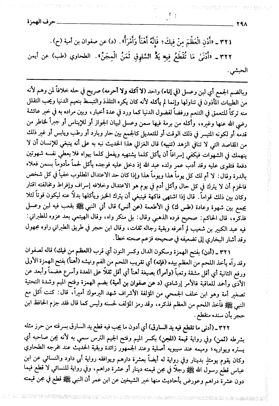 321 - (أدن) بفتح الهمزة وسكون الدال وكسر النون أي قرب (العظم من فيك) قاله لصفوان وقد رآه يأخذ اللحم من العظم بيده (فإنه) أي تقريب اللحم من الفم ونهشه (أهنأ) بفتح الهمزة الأولى ورفع الثانية أي أقل مشقة وتعبا (وأمرأ) بصيغة أهنأ أي أقل ثقلا على المعدة وأسرع هضما وأبعد عن الأذى وأحمد للعاقبة فالأمر إرشادي.