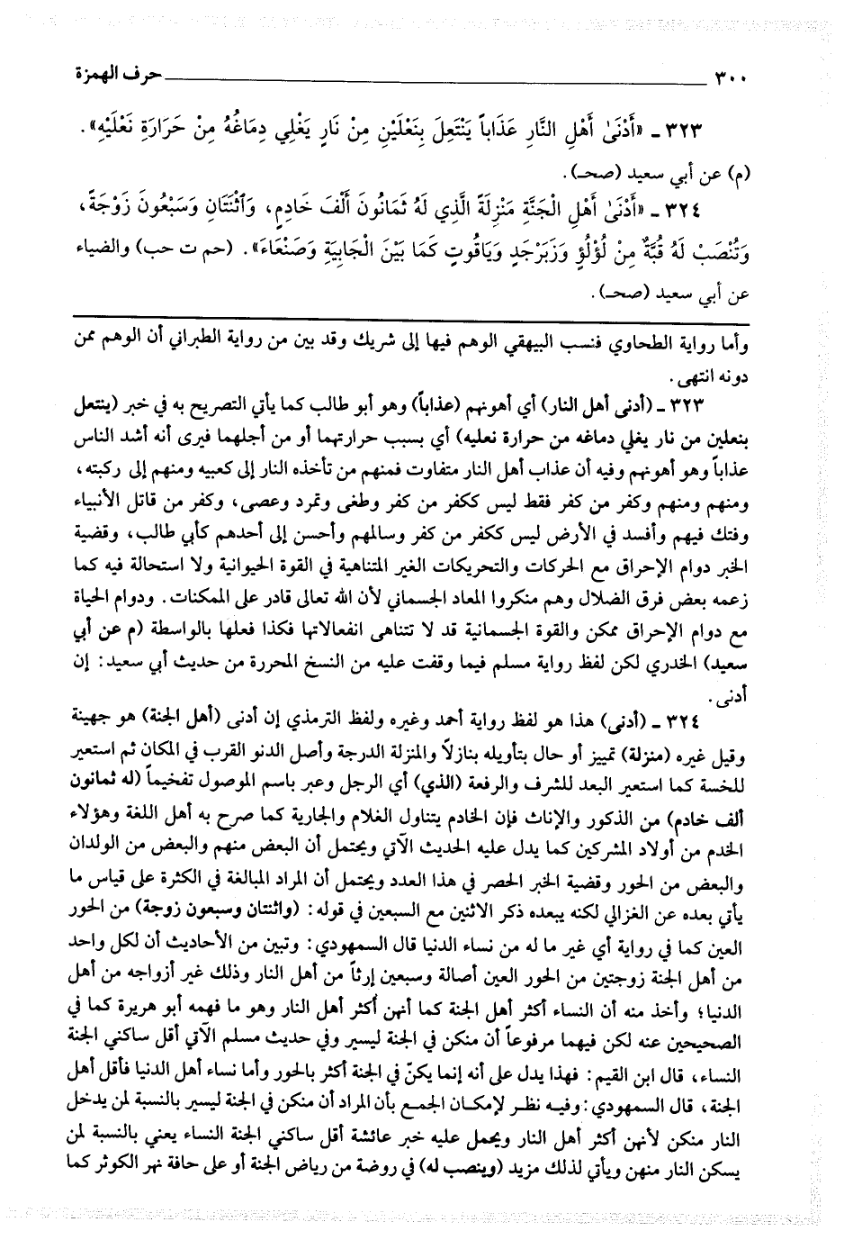 323 - (أدنى أهل النار) أي أهونهم (عذابا) وهو أبو طالب كما يأتي التصريح به في خبر (ينتعل بنعلين من نار يغلي دماغه من حرارة نعليه) أي بسبب حرارتهما أو من أجلهما فيرى أنه أشد الناس عذابا وهو أهونهم وفيه أن عذاب أهل النار متفاوت فمنهم من تأخذه النار إلى كعبيه ومنهم إلى ركبتيه ، ومنهم ومنهم وكفر من كفر فقط ليس ككفر من كفر وطغى وتمرد وعصى ، وكفر من قاتل الأنبياء وفتك فيهم وأفسد في الأرض ليس ككفر من كفر وسالمهم وأحسن إلى أحدهم كأبي طالب ، وقضية الخبر دوام الإحتراق مع الحركات والتحريكات الغير المتناهية في القوة الحيوانية ولا استحالة فيه كما زعمه بعض فرق الضلال وهم منكروا المعاد الجسماني لأن الله تعالى قادر على الممكنات ، ودوام الحياة مع دوام الإحراق ممكن والقوة الجسمانية قد لا تتناهى انفعالاتها فكذا فعلها بالواسطة (م عن أبي سعيد) الخدري لكن بلفظ رواية مسلم فيما وقفت عليه من النسخ المحررة من حديث أبي سعيد : إن