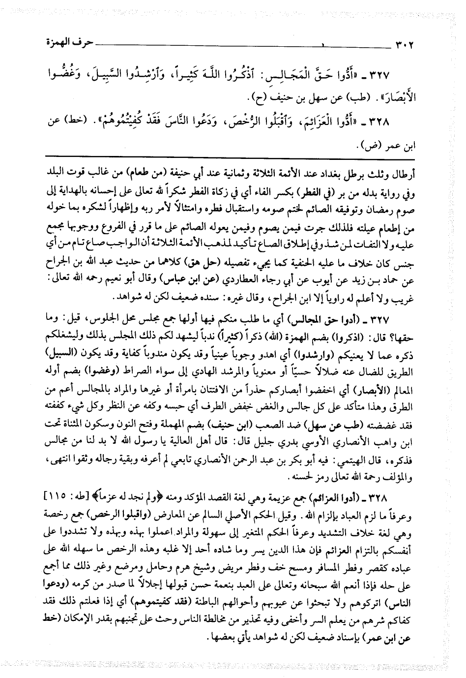 327 - (أدوا حق المجالس) أي ما طلب منكم فيها أولها جمع مجلس محل الجلوس قيل وما حقها قال (اذكروا) بضم الهمزة (الله) ذكرا (كثيرا) ندبا ليشهد لكم ذلك المجلس بذلك وليشغلكم ذكره عما لا يعنيكم (وارشدوا) أي اهدوا وجوبا عينيا وقد يكون مندوبا كفاية وقد يكون السبيل) الطرق للضال عنه ضلالا حسيا أو معنويا والمرشد الهادي إلى سواء الصراط (وغضوا) بضم أوله المعمم (الأبصار) أي اخفضوا أبصاركم حذرا من الإفتتان بامرأة أو غيرها والمراد بالمجالس أعم من الطرق وهذا متأكد على كل جالس والغض خفض الطرف أي حبسه وكفه عن النظر وكل شئ كففته فقد غضضته.