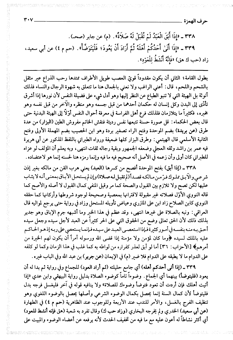 339 - (إذا أتى أحدكم أهله) أي جامع حليلته (ثم أراد العود) للجماع وفي رواية بدا له أن يعود (فليتوضأ) بينهما أي الجماعين وضوءا تاما كوضوء الصلاة بدليل رواية البيهقي وابن عدي إذا أتيت أهلك فإن أردت أن تعود فتوضأ وضوءك للصلاة ولا ينافيه قوله في آخر فليغسل فرجه بدل فليتوضأ لأن كمال السنة إنما يحصل بكمال الوضوء الشرعي وأصلها يحصل بالوضوء اللغوي وهو تنظيف الفرج بالغسل ، والأمر للندب عند الأربعة وللوجوب عند الظاهرية.