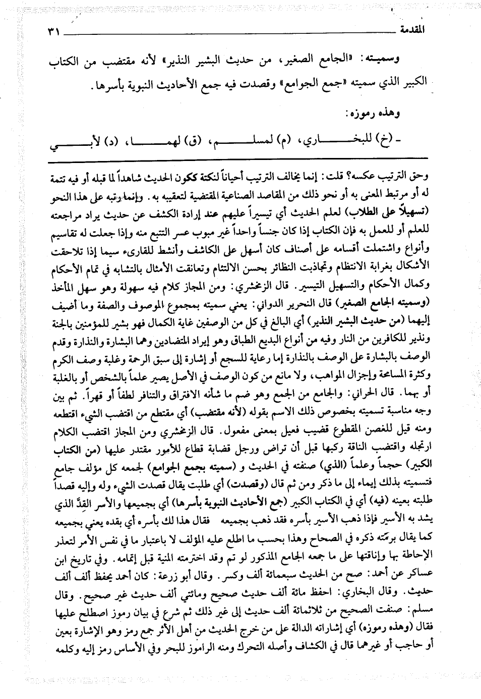 قال الزمخشري : ومن المجاز كلام فيه سهولة وهو سهل المأخذ (وسميته الجامع الصغير) قال النحرير الدواني : يعني سميته بمجموع الموصوف والصفة وما أضيف إليهما (من حديث البشير النذير) أي البالغ في كل من الوصفين غاية الكمال فهو بشير للمؤمنين بالجنة ونذير للكافرين من النار وفيه من أنواع البديع الطباق وهو إيراد المتضادين وهما البشارة والنذارة وقدم الوصف بالبشارة على الوصف بالنذارة إما رعاية للسجع أو إشارة إلى سبق الرحمة وغلبة وصف الكرم وكثرة المسامحة وإجزال المواهب ، ولا مانع من كون الوصف في الأصل يصير علما بالشخص أو بالغلبة أو بهما.