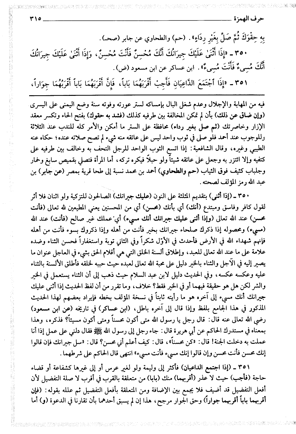 350 - (إذا أثنى) بتقديم المثلثة على النون (عليك جيرانك) الصالحون للتزكية ولو اثنان فلا أثر