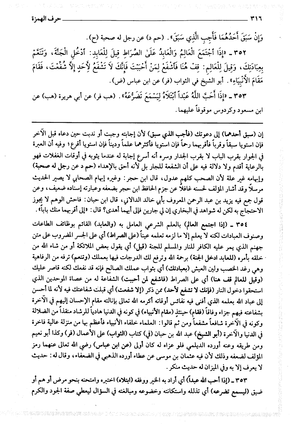 352 - (إذا اجتمع العالم) بالعلم الشرعي العامل به والعابد) القائم بوظائف الطاعات وصنوف العبادات لكنه لا يعلم إلا ما لزمه تعلمه عينا (على الصراط) أي على الجسر المضروب على متن جهنم الذي يمر عليه الكافر للنار والمسلم للجنة (قيل) أي يقول بعض الملائكة أو من شاء الله من خلقه بأمره (للعابد أدخل الجنة) برحمة الله وترفع لك الدرجات فيها بعملك وتنعم) ترفه من الرفاهية وهي رغد الخصب ولين العيش (بعبادتك) أي بثواب عملك الصالح فإنه قد نفعك لكنه قاصر عليك (وقيل للعالم قف هنا) أي على الصراط (فاشفع لمن أحببت) الشفاعة له من عصاة الموحدين الذين استحقوا دخول النار (فإنك لا تشفع لأحد) ممن ذكر (إلا شفعت) أي قبلت شفاعتك فيه لأنه لما أحسن إلى عباد الله بعلمه الذي أفنى فيه نفائس أوقاته أكرمه الله تعالى بإنالته مقام الإحسان إليهم في الآخرة بشفاعته قيهم جزاء وفاقا (فقام) حينئذ (مقام الأنبياء) في كونه في الدنيا هاديا للرشاد منقذا من الضلالة وكونه في الآخرة شافعا مشفعا ومن ثم قالوا العلماء خلفاء الأنبياء فأعظم بها من منزلة عالية فاخرة في الدنيا والآخرة (أبو الشيخ [ ابن حبان ]) عبد الله بن حبان (في) كتاب (الثواب) على الأعمال (فر) وكذا أبو نعيم ومن طريقه وعنه أورده الديلمي فلو عزاه له كان أولى (عن ابن عباس) رضي الله تعالى عنهما رمز المؤلف لضعفه وذلك لأن فيه عثمان بن موسى عن عطاء أورده الذهبي في الضعفاء وقال له حديث لا يعرف إلا به وفي الميزان له حديث منكر.