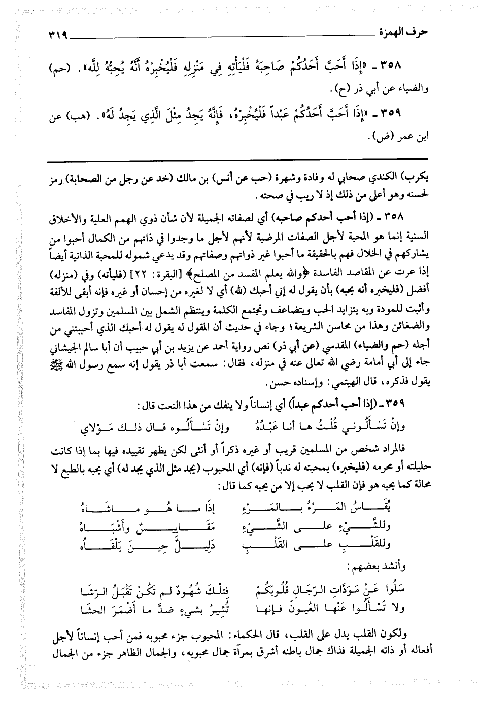 359 - (إذا أحب أحدكم عبدا) أي إنسانا ولا ينفك من هذا النعت قال : وإن تسألوني قلت ها أنا عبده * وإن تسألوه قال ذلك مولاي فالمراد شخص من المسلمين قريب أو غيره ذكرا أو أنثى لكن يظهر تقييده فيها بما إذا كانت حليلته أو محرمه (فليخبره) بمحبته له ندبا (فإنه) أي المحبوب (يجد مثل الذي يجد له) أي يحبه بالطبع لا محالة كما يحبه هو فإن القلب لا يحب إلا من يحبه كما قال : يقاس المرء بالمرء * إذا ما هو ماشاه وللشئ على الشئ * مقاييس وأشباه وللقلب على القلب * دليل حين يلقاه وأنشد بعضهم : سلوا عن مودات الرجال قلوبكم * فتلك شهود لم تكن تقبل الرشا ولا تسألوا عنها العيون فإنها * تشير بشئ ضد ما أضمر الحشا ولكون القلب يدل على القلب قال الحكماء المحبوب جزء محبوبه فمن أحب إنسانا لأجل أفعاله أو ذاته الجميلة فذاك جمال باطنه أشرق بمرآة جمال محبوبه والجمال الظاهر جزء من الجمال