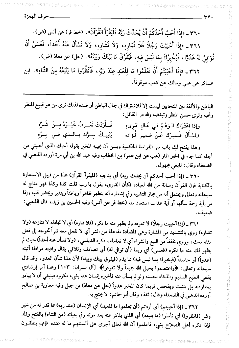 361 - (إذا أحببت رجلا) لا تعرفه ولم يظهر منه ما تكره (فلا تماره) أي لا تجادله ولا تنازعه (ولا تشاره) روي بالتشديد من المشارة وهي المضادة مفاعلة من الشر أي لا تفعل معه شرا تحوجه إلى فعل مثله معك وروي مخففا من البيع والشراء أي لا تعامله ذكره الديلمي (ولا تسأل عنه أحدا) حيث لم يظهر لك منه ما تكره (فعسى) أي ربما (أن توافي له) أي تصادف وتلاقي يقال وافيته موافاة أتيته (عدوا) أو حاسدا (فيخبرك بما ليس فيه) مما يذم (فيفرق بينك وبينه) لأن هذا شأن العدو وقد قال سبحانه وتعالى * (واعتصموا بحبل الله جميعا ولا تفرقوا) * وهذا أمر إرشادي يقضي الطبع السليم والذكاء بحسنه ولو لم يسأل عنه فأخبره إنسان عنه بشئ مكروه فينبغي أن لا يبادر بمفارقته بل يتثبت ويفحص فربما كان المخبر عدوا (حل عن معاذ) بن جبل وفيه معاوية بن صالح أورده الذهبي في الضعفاء وقال ثقة وقال أبو حاتم لا يحتج به.