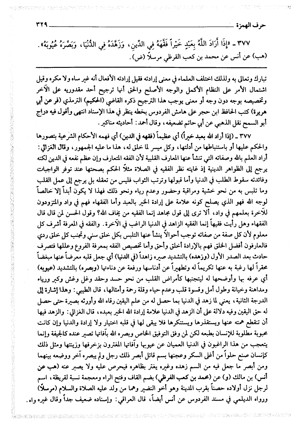 377 - (إذا أراد الله بعبد خيرا) أي عظيما (فقهه في الدين) أي فهمه الأحكام الشرعية بتصورها والحكم عليها أو باستنباطها من أدلتها ، وكل ميسر لما خلق له ، هذا ما عليه الجمهور ، قال الغزالي : أراد العلم بالله وصفاته التي تنشأ عنها المعارف القلبية لأن الفقه المتعارف وإن عظم نفعه في الدين لكنه يرجع إلى الظواهر الدينية إذ غايته نظر الفقيه في الصلاة مثلا الحكم بصحتها عند توفر الواجبات وفائدته سقوط الطلب في الدنيا وأما قبولها وترتب الثواب فليس من تعقله بل يرجع إلى عمل القلب وما تلبس به من نحو خشية ومراقبة وحضور وعدم رياء ونحو ذلك فهذا لا يكون أبدا إلا خالصا لوجه الله فهو الذي يصلح كونه علامة على إرادة الخير بالعبد وأما الفقهاء فهم في واد والمتزودون للآخرة بعلمهم في واد ، ألا ترى إلى قول مجاهد إنما الفقيه من يخاف الله ؟ وقول الحسن لمن قال قال الفقهاء وهل رأيت فقيها إنما الفقيه الزاهد في الدنيا الراغب في الآخرة.
