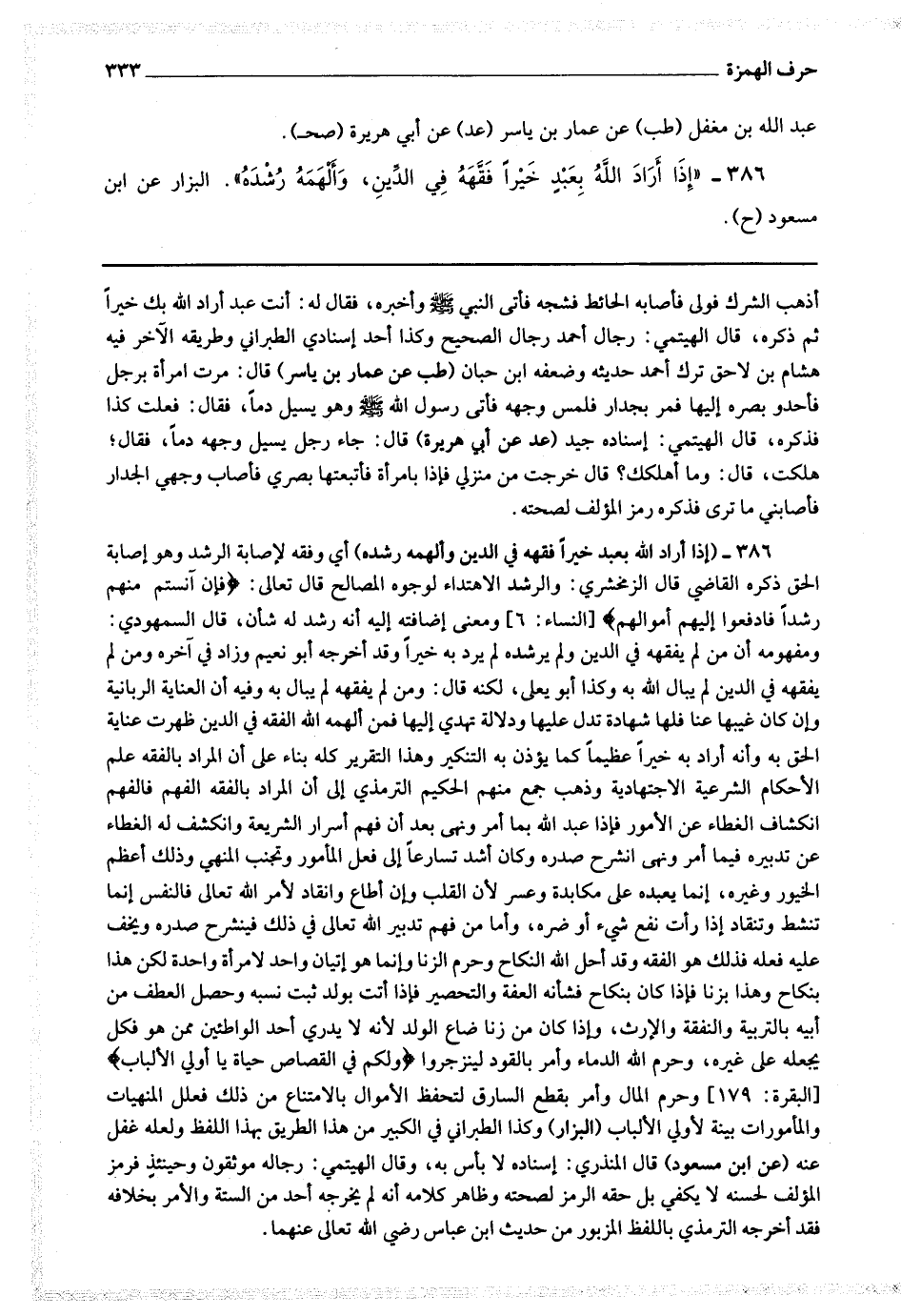 386 - (إذا أراد الله بعبد خيرا فقهه في الدين وألهمه رشده) أي وفقه لإصابة الرشد وهو إصابة الحق ذكره القاضي.