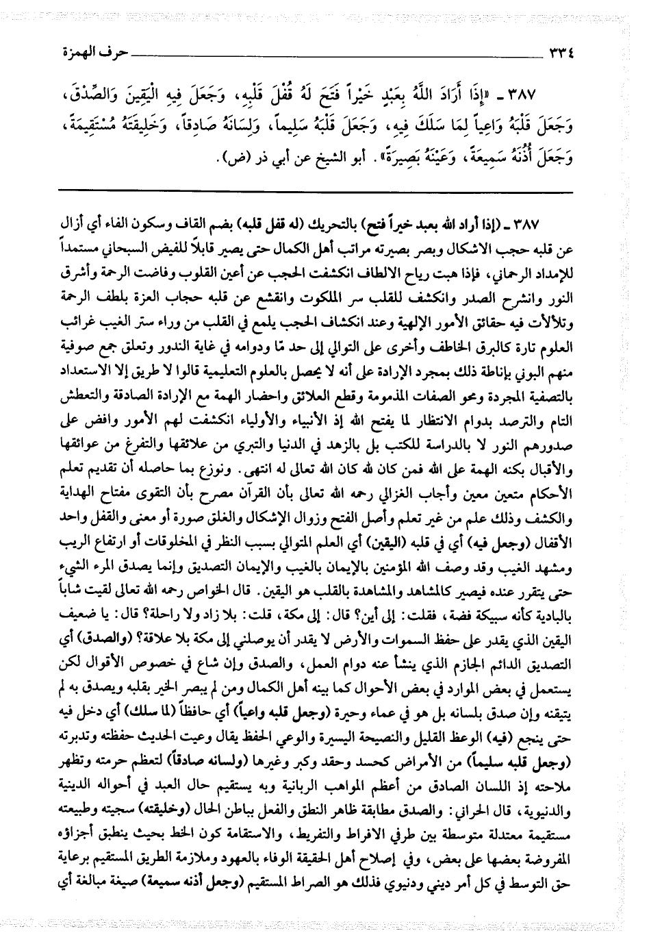 387 - (إذا أراد الله بعبد خيرا فتح) بالتحريك (له قفل قلبه) بضم القاف وسكون الفاء أي أزال عن قلبه حجب الأشكال وبصر بصيرته مراتب أهل الكمال حتى يصير قابلا للفيض السبحاني مستمدا للإمداد الرحمني فإذا هبت رياح الألطاف انكشفت الحجب عن أعين القلوب وفاضت الرحمة وأشرق النور وانشرح الصدر وانكشف للقلب سر الملكوت بلطف الرحمة انكشاف الحجب يلمع القلب من وراء ستر الغيب غرائب العلوم تارة كالبرق الخاطف وأخرى على التوالي إلى حد ما وداومه في غاية الندور وتعلق جمع صوفية منهم البوني بإناطة ذلك بمجرد الإرادة على أنه لا يحصل بالعلوم التعليمية قالوا لا طريق إلا الاستعداد بالتصفية المجردة ومحو الصفات المذمومة وقطع العلائق واحضار الهمة مع الإرادة الصادقة والتعطش التام والترصد بدوام الانتظار لما يفتح الله إذ الأنبياء والأولياء انكشفت لهم الأمور وفاض على صدورهم النور لا بالدراسة للكتب بل بالزهد في الدنيا والتبري من علائقها والتفرغ من عوائقها والإقبال بكنه الهمة على الله فمن كان لله كان الله تعالى له انتهى ونوزع بما حاصله أن تقديم تعلم الأحكام متعين معين وأجاب الغزالي رحمه الله تعالى بأن القرآن مصرح بأن التقوى مفتاح الهداية والكشف وذلك علم من غير تعلم وأصل الفتح زوال الإشكال والغلق صورة أو معنى والقفل واحد الأقفال (وجعل فيه) أي في قلبه (اليقين) أي العلم المتوالي بسبب النظر في المخلوقات أو ارتفاع الريب ومشهد الغيب وقد وصف الله المؤمنين بالإيمان بالغيب والإيمان التصديق وإنما يصدق المرء الشئ حتى يتقرر عنده فيصير كالمشاهد والمشاهدة بالقلب هو اليقين.