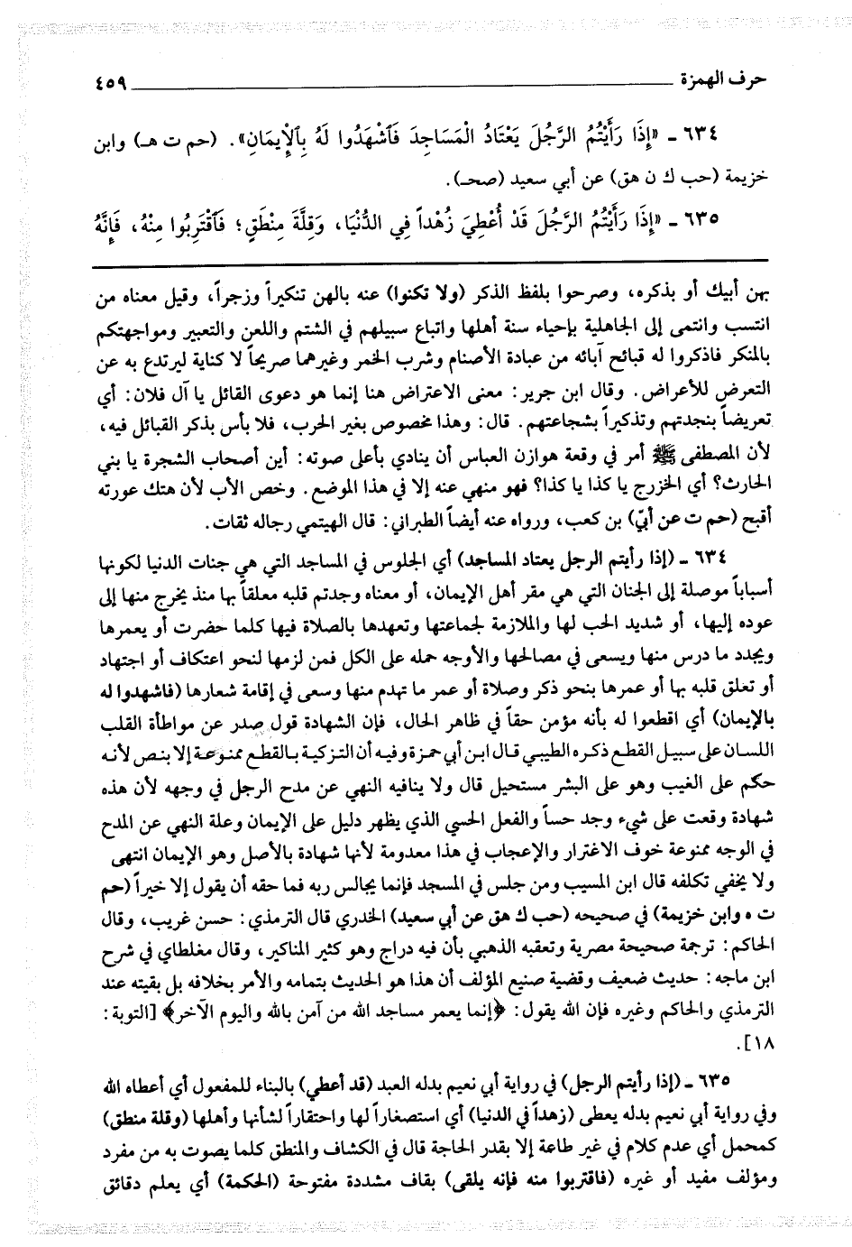 634 - (إذا رأيتم الرجل يعتاد المساجد) أي الجلوس في المساجد التي هي جنات الدنيا لكونها أسبابا موصلة إلى الجنان التي هي مقر أهل الإيمان ، أو معناه وجدتم قلبه معلقا بها منذ يخرج منها إلى عوده إليها ، أو شديد الحب لها والملازمة لجماعتها وتعهدها بالصلاة فيها كلما حضرت أو يعمرها