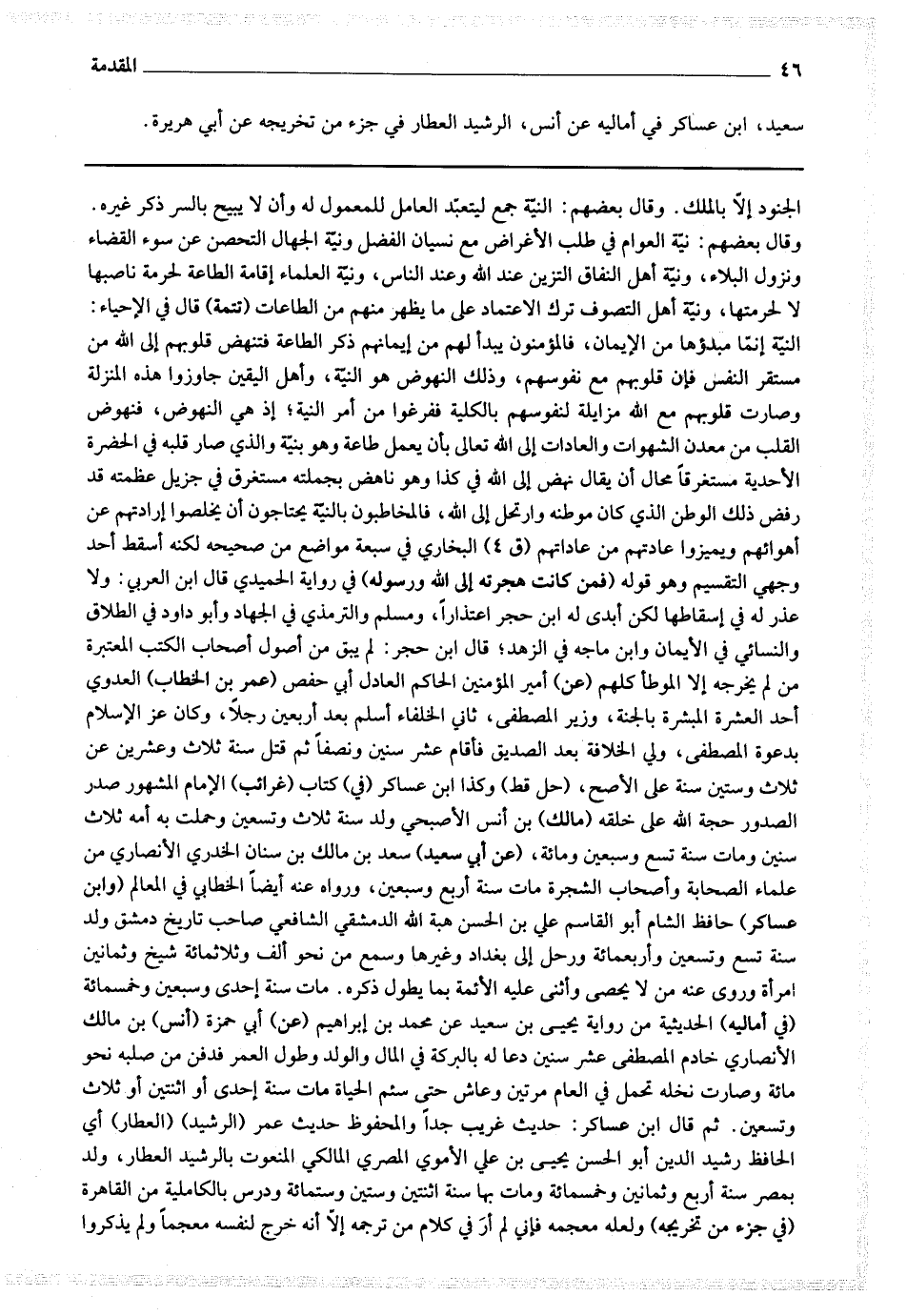 لا لحرمتها ونية أهل التصوف ترك الاعتماد على ما يظهر منهم من الطاعات (تتمة) قال في الإحياء : النية إنما مبدؤها من الإيمان ، فالمؤمنون يبدأ لهم من إيمانهم ذكر الطاعة فتنهض قلوبهم إلى الله من مستقر النفس فإن قلوبهم مع نفوسهم ، وذلك النهوض هو النية ، وأهل اليقين جاوزوا هذه المنزلة وصارت قلوبهم مع الله مزايلة لنفوسهم بالكلية ففرغوا من أمر النية ، إذ هي النهوض ، فنهوض القلب من معدن الشهوات والعادات إلى الله تعالى بأن بعمل طاعة وهو بنية والذي صار قلبه في الحضرة الأحدية مستغرقا محال أن يقال نهض إلى الله في كذا وهو ناهض بجملته مستغرق في جزيل عظمته قد رفض ذلك الوطن الذي كان موطئه وارتحل إلى الله ، فالمخاطبون بالنية يحتاجون أن يخلصوا إرادتهم عن أهوائهم ويميزوا عادتهم من عاداتهم - (ق 4) البخاري في سبعة مواضع من صحيحه لكنه أسقط أحد وجهي التقسيم وهو قوله " فمن كانت هجرته إلى الله ورسوله " في رواية الحميدي قال ابن العربي : ولا عذر له في إسقاطها لكن أبدى له ابن حجر اعتذارا ، ومسلم والترمذي في الجهاد وأبو داود في الطلاق والنسائي في الأيمان وابن ماجه في الزهد : قال ابن حجر : لم يبق من أصول أصحاب الكتب المعتبرة من لم يخرجه إلا الموطأ كلهم (عن) أمير المؤمنين الحاكم العادل أبي حفص (عمر بن الخطاب) العدوي أحد العشرة المبشرين بالجنة ، وزير المصطفى ، ثاني الخلفاء أسلم بعد أربعين رجلا ، وكان عز الإسلام بدعوة المصطفى ، ولي الخلافة بعد الصديق فأقام عشر سنين ونصفا ثم قتل سنة ثلاث وعشرين عن ثلاث وستين سنة على الأصح.