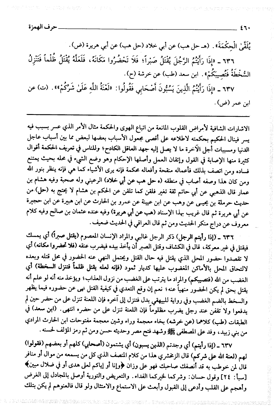 636 - (إذا رأيتم الرجل) ذكر الرجل غالبي والمراد الإنسان المعصوم (يقتل صبرا) أي يمسك فيقتل في غير معركة ، قال في الكشاف : وقتل الصبر أن يأخذ بيده فيضرب عنقه (فلا تحضروا مكانه) أي لا تقصدوا حضور المحل الذي يقتل فيه حال القتل ويحتمل النهي عن الحضور في محل قتله وقته وبعده لالتحاق المحل بالأماكن المغضوب عليها كديار ثمود (فإنه لعله يقتل ظلما فتنزل السخطة) أي الغضب من الله (فتصيبكم) والمراد ما يترتب على الغضب من نزول العذاب ، ويؤخذ منه أنه لو علم أنه يقتل بحق لم يكن الحضور منهيا عنه ، نعم إن وقع التعدي في كيفية القتل نهى عن حضوره فيما يظهر والسخط بالضم الغضب وفي رواية للبيهقي بدل فتنزل إلى آخره فإن اللعنة تنزل على من حضر حين لم يدفعوا ولا تقفن عند رجل يضرب مظلوما فإن اللعنة تنزل على من حضره انتهى (ابن سعد) في الطبقات (طب) كلاهما (عن خرشه) بخاء معجمة وراء وشين معجمة مقتوحات ابن الحارث المرادي من بني زبيد ، وفد على المصطفى صلى الله عليه وسلم وشهد فتح مصر وحديثه حسن ومن ثم رمز المؤلف لحسنه.
